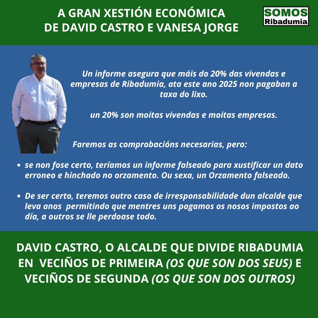 Outro dato sorprendente que se desprende do Informe de Intervención, que haberá que comprobar por que podería ser falso, máis 20% das vivendas e empresas do noso Concello non estarían pagando o recibo do lixo antes de 2025, xustificando nunha suposta revisión do censo de vivendas e negocios parte da suba de ingresos por taxa de lixo neste 2025. “Se isto foi así queremos saber se foi por irresponsabilidade da veciñanza e das empresas, algo difícil de creer nesa cantidade, ou por neglixencia do goberno local. Imos pedir a documentación desa revisión para comprobar cantas vivendas e empresas estaban fora da norma, e os motivos, e de confirmarse neglixencia por parte do Concello, esixiremos responsabilidades políticas. David Castro leva dez anos e medio de alcalde, e é a súa responsabilidades exclusiva asegurarse de que a veciñanza e as empresas son todas tratadas por igual e que se cumpre a lexislacion“.