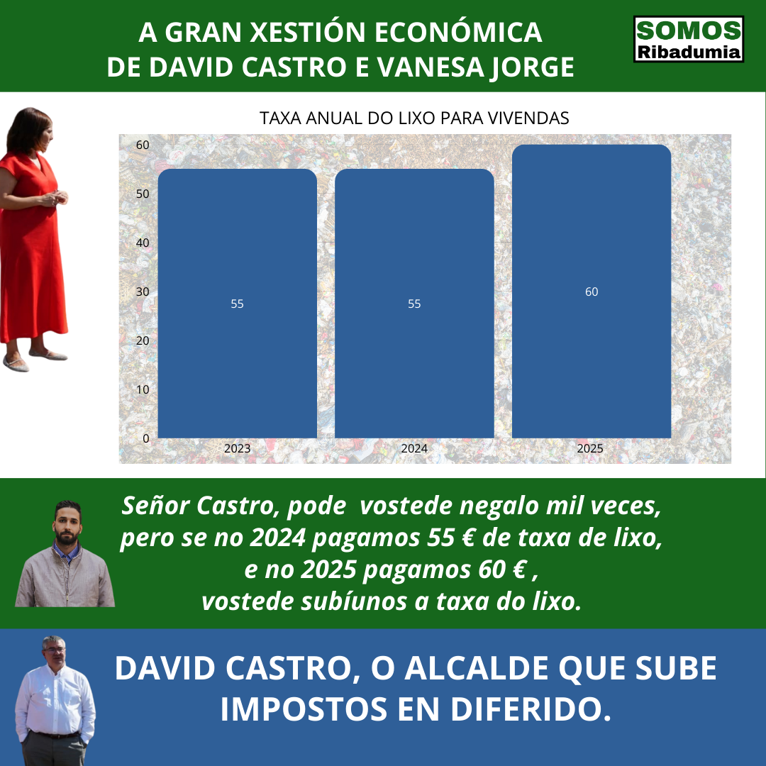 A secuencia dos feitos é a seguinte. No 2019, estando Somos Ribadumia no goberno, xestionouse un convenio con SOGAMA que deu como resultado unha rebaixa do 10% do prezo da tonelada que dende o goberno repercutimos á veciñanza na mesma proporción, por certo aprobando a nova taxa en Pleno. No 2023 a Xunta aumentou esa bonificación ata o 15%, pero os Concellos tiñan que cumprir antes de 2025 unhas condicións, entre elas a implantación do contador marrón. David Castro non repercutiu este aumento da bonificación á veciñanza, pero tampouco cumpriu as condicións da Xunta e ao final rematou por perder a totalidade da bonificación. O que non tiña obriga ningunha de facer é subir a taxa á veciñanza, pero subiuna un 10%.