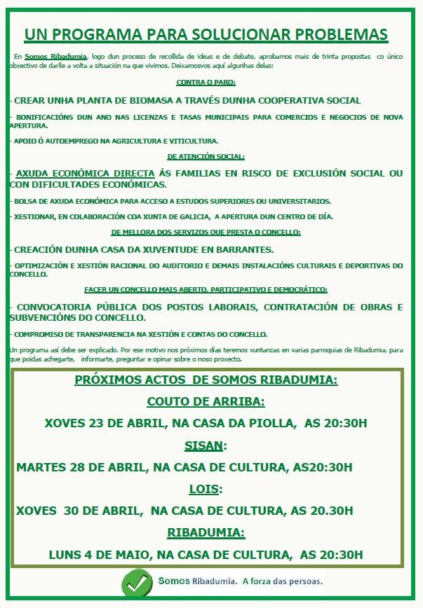 O que si queremos deixar claro e que por respecto a democracia e pluralidade NUNCA ACUDIREMOS A ACTOS OU DEBATES ONDE NON ESTEAN CONVIDADOS TODAS AS CANDIDATURAS. En SOMOS RIBADUMIA creemos profundamente na democracia e no respecto a pluralidade política, e o “que non queremos para a nosa candidatura non o aceptamos para as demais”; de ahí que non aceptaremos vetos ou exclusións “interesadas” por parte de medios de comunicación ou outras organizacións políticas que se din moi abertas e democráticas pero logo aceptan regras de xogo onde se exclúe tacitamente a outras partes.