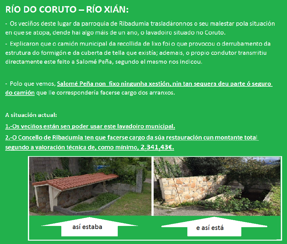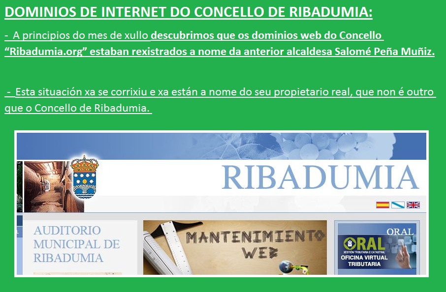 Agora queremos informar publicamente dos mesmos, para que os veciños de Ribadumia saiban o que hai, animándoos a que se acheguen polas oficinas municipais para comprobar esta información se o consideran oportuno: