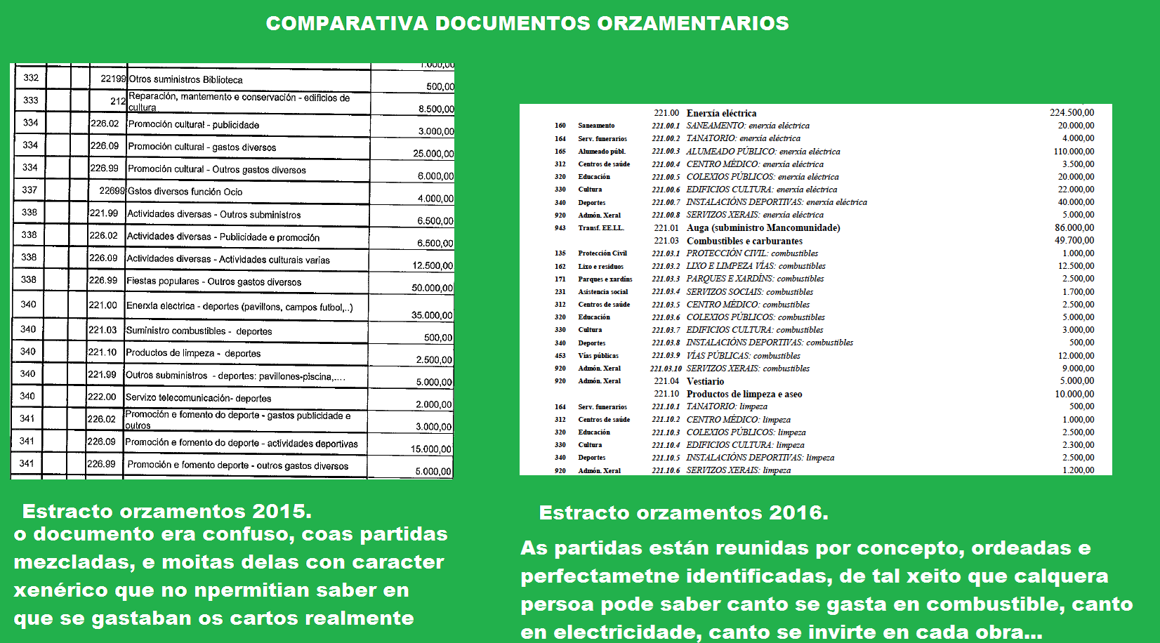 En resumo, tal como explica o equipo de goberno, este orzamento foi elaborado dun xeito moito mais claro e específico, que permitira situar cada partida económica nun apartado determinado perfectamente identificable, e así facilitar, non solo a comprensión por parte de calquera veciño, se non tamén a xestión das diferentes partidas, e comezar así un camiño de mellora no ordenamento e uso dos recursos municipais