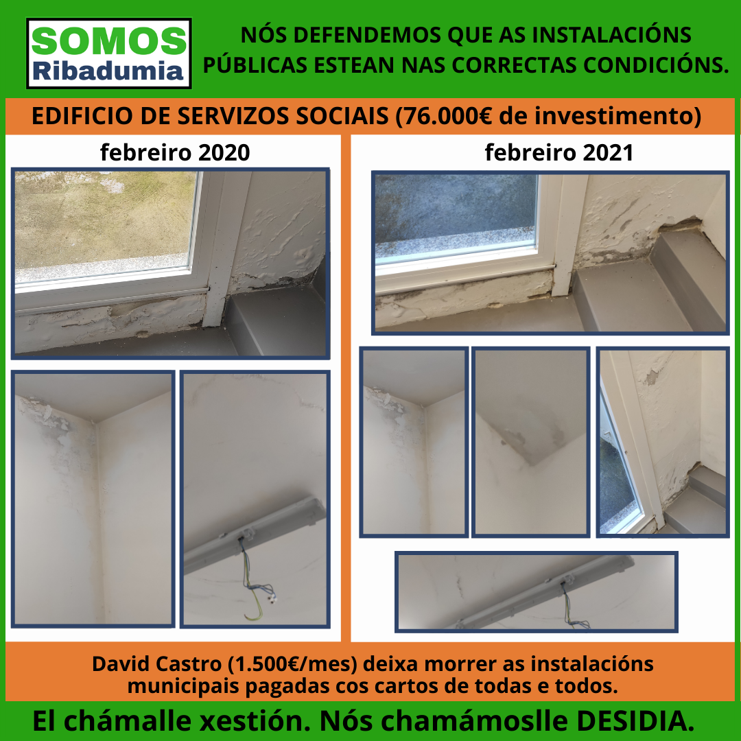 Dende Somos Ribadumia lamentamos a desidia do goberno local, e en particular tanto do alcalde como das concelleiras de política social é a de urbanismo, que por certo cobra unha liberación sen que teñamos claro, á vista dos feitos, en que emprega o seu tempo. E pedimos, unha vez máis, ao goberno local que asuma as súas responsabilidades, e solucione os problemas que teñen os edificios municipais, tanto neste caso como no resto e edificios e noutros espazos públicos, “Porque non é só este edificio. Aos parques infantís non lles tocou ninguén dende que nós saímos do goberno, algo que xa denunciamos a finais do ano pasado, é antes diso no outono do 2019.