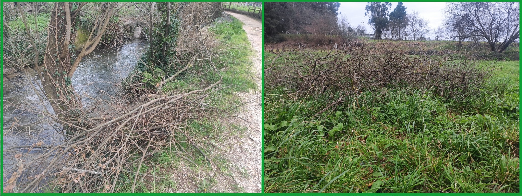 Porén, se non era bastante coa poda, que dende Somos Ribadumia interpretamos que consistiu, como xa aconteceu cunha roza realizada na primaveira pasada que denunciamos no seu momento (enlace aquí), na aplicación dos criterios de xardinaría do alcalde ou dalgunha das súas concelleiras ou máis probablemente de quen dirixe o partido, a unha contorna natural, resulta que o goberno nin sequera se preocupou de ordenar retirar todos os restos da poda, deixándoos á beira do río, co perigo de que os arrastre a auga e provoque atrancos e desbordamentos innecesarios, e no medio de fincas privadas, e que por moi colaboradores que sexan os propietarios, non merecen que como agradecemento a broza lles quede semanas coa herba medrando polo medio.