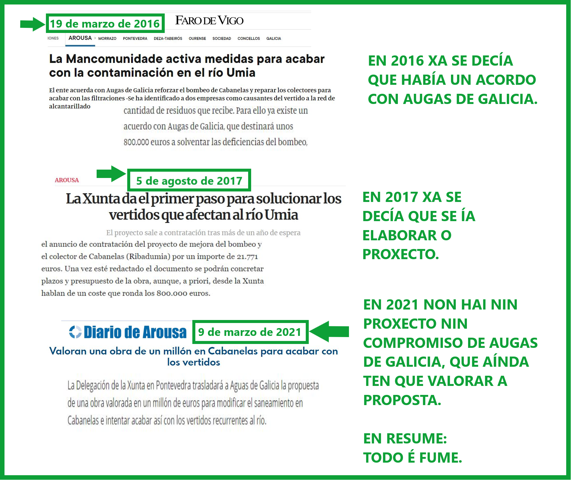 “David Castro e Gonzalo Durán suman esforzos para anunciar fume de leña verde”. Así se refire Enrique Oubiña ao anuncio feito polos alcaldes de Ribadumia e Vilanova de Arousa logo de reunirse co delegado da Xunta, supostamente para tratar o problema dos verquidos ao Umia do bombeo de Cabanelas.