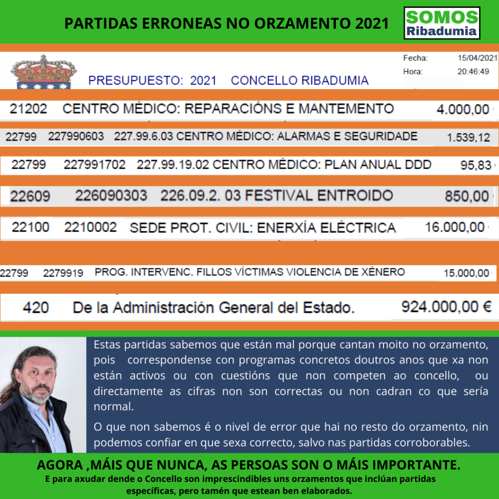 O texto inclúe, e así se aprobou, erros de transcrición, como por exemplo unha partida de 16.000€ para pagar a factura eléctrica do local de protección civil, que habitualmente anda nos 1.500€,