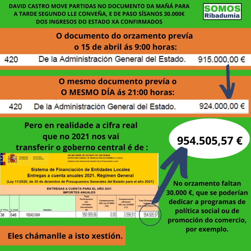 Ademais, esta foi a partida que puxo de exemplo Oubiña para demostrar as mentiras que o goberno local usa para non incluír as nosas propostas, que para este ano suporían 28 cambios no orzamento, a maioría axustes de partidas existentes, unha modificación orzamentaria que, sen mover o total do orzamento salvo a inclusión do que o goberno local nos rouba, repercutiría en axudas reais aos sectores máis afectados pola pandemia, pero tamén en investimentos en cultura, deporte e xuventude, a gran abandonada deste goberno. “O pasado xoves pola mañá o goberno central ía ingresarnos – segundo previsión orzamentaria – 915.000€, e logo pola tarde xa resultou que o goberno central en realidade ía ingresarnos 924.000€, 9.000 € que se moveron apertando un botón”. Este cambio, xunto á eliminación de varias partidas que eran imprescindibles as nove da maña e innecesarias as tres da tarde, foi motivado por unha reclamación dos sindicatos, que o goberno se viu obrigado a aceptar. O asunto serviu para demostrar que “David canto menos poida pagar mellor, e so sube salarios – salvo o del – se o obriga a lei”, e que os orzamentos non están escritos en pedra.
