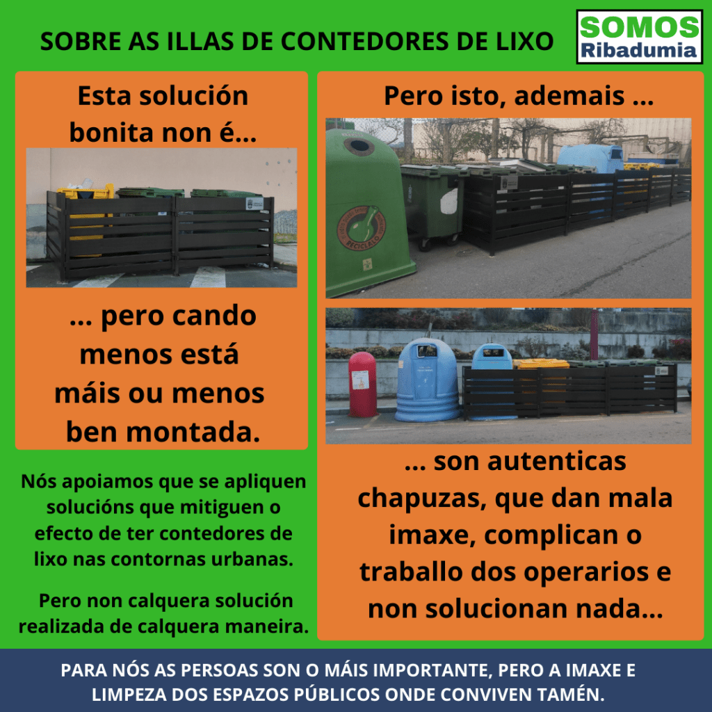Tal como se expresou no pleno, dende Somos Ribadumia sempre nos amosamos a favor de mitigar a mala imaxe das agrupacións de contedores nos núcleos de poboación, e tamén de buscar solucións para evitar que nos días de vento forte os contedores se desprazaran do seu lugar ou emborcaran, porque ademais dos problemas de salubridade créanse problemas de seguridade viaria. E por ese motivo estivemos a favor de que se investisen cartos na compra e instalación de illas de contedores e de amarres individuais.