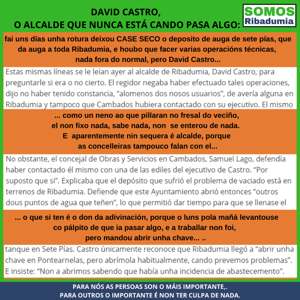 No que dende Somos Ribadumia queremos afondar é na actitude de David Castro, “ que agora resulta que non traballa os domingos, nin tampouco os luns. Que iso eu créollo ben, pero o que non se cree ninguén é que non fale coas súas concelleiras, e que non se entera de nada do que acontece”.