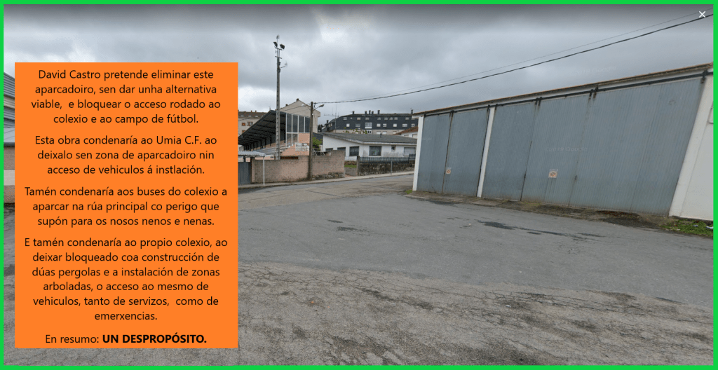 A obra que David Castro ten enriba da mesa pretende eliminar toda a zona na que actualmente estacionan os buses escolares e que serve de aparcadoiro para o campo do Umia fora do horario lectivo, e transformalo nunha zona de esparcemento para o colexio, cun patio semi-cuberto, que é como dicir que non cobre nada, e unhas árbores a facer bonito. O problema desta idea, “ademais de que apenas soluciona nada ao colexio, que está necesitado de espazos, pero espazos ben dotados, non pérgolas, é que elimina toda a área de aparcadoiro actual, sen aportar ningunha solución alternativa, deixando ao Umia sen aparcadoiro, aos buses escolares sen unha zona segura onde parar a deixar é recoller ao alumnado e ao colexio sen acceso rodado por onde meter un camion de bombeiros, ou un vehiculo grande como unha furgón ou unha ambulancia”.