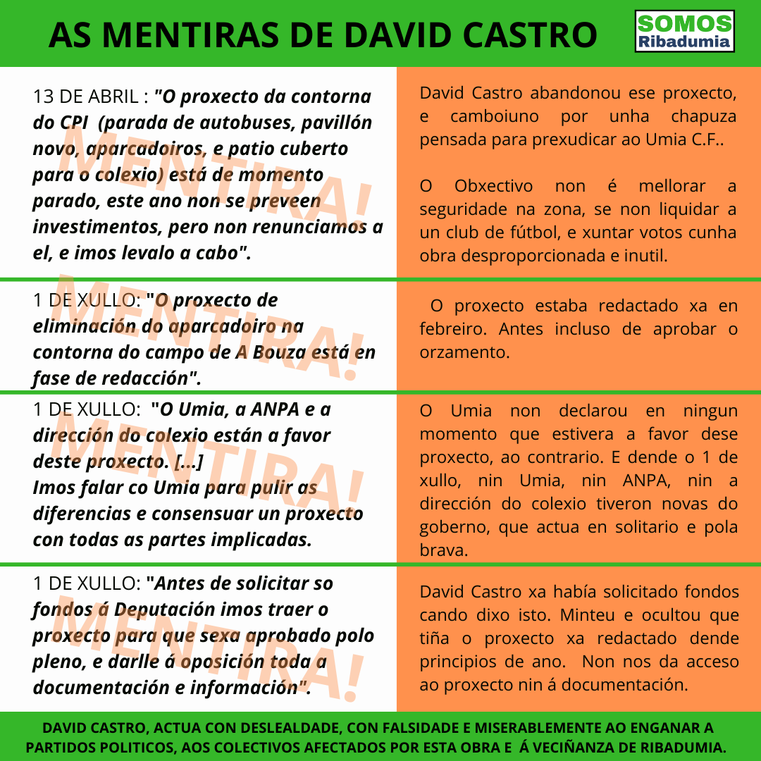 Polo tanto, de partida “resulta que o proxecto que David Castro asegurou en xullo que estaba en proceso de redacción, levaba dende principios de anos redactado e xa estaba presentado na Deputación. Disto despréndese que todo canto David Castro fixo co Umia C. F. e coa comunidade escolar foi un paripé, pois o proxecto xa estaba definido e decidido. Polo tanto, David Castro en ningún momento tivo intención de consensuar este proxecto con ninguén”. Que dende o momento en que Somos Ribadumia fixemos públicas as súas intencións de eliminar o aparcadoiro do Colexio David Castro non volvese reunirse con ningún dos colectivos afectados, e optara polo silencio, confirma claramente que ese proxecto se vai impoñer pola forza.