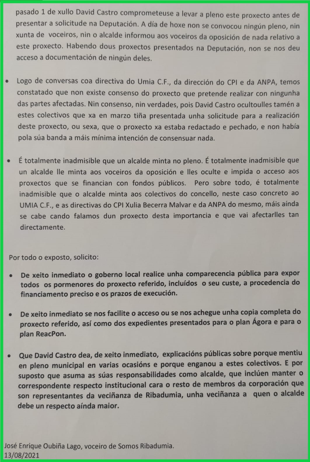 Dende o noso punto de vista é totalmente inadmisible que un alcalde minta no pleno, minta aos voceiros da oposición e lles oculte e impida o acceso aos proxectos que se financian con fondos públicos. Pero sobre todo, é totalmente inadmisible que o alcalde minta aos colectivos do concello, neste caso concreto ao UMIA C.F., e as directivas do CPI Xulia Becerra Malvar e da ANPA do mesmo, máis aínda se cabe cando falamos dun proxecto desta importancia e que vai afectarlles tan directamente.
