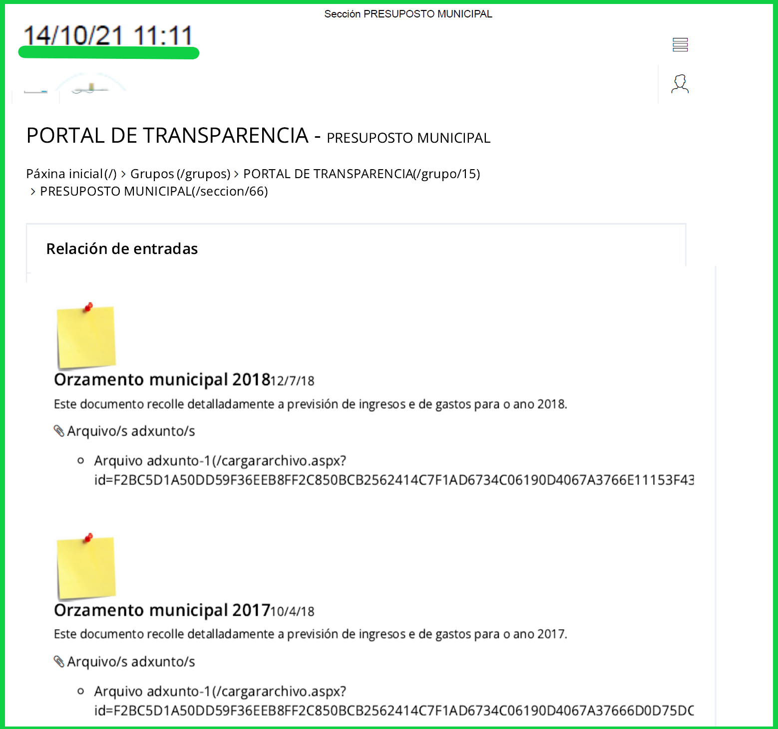 De partida o goberno local abandonou por completo as súas obrigas en canto á transparencia pública. No preceptivo Portal de Transparencia do Concello de Ribadumia pode comprobarse como a única páxina minimamente actualizada é a correspondente coa web de Contratos Públicos, onde a día 15 de outubro do 2021 a páxina de licitacións tiña a última licitación con data de xullo de 2020. As actas dos plenos municipais, que deben aprobarse no pleno inmediatamente posterior non so non se aproban, senón que a día de hoxe hai actas do ano 2020 sen aprobar nin facerse públicas. Ademais disto, as gravacións das últimas sesións plenarias, que teñen o valor de video-acta, non están accesibles nin aparecen no Portal de transparencia, e as que se poden consultar na canle de youtube do Concello, son gravacións parciais. Non se fan públicos os orzamentos dende o ano 2018. Non se publican bandos dende o ano 2016 de xeito público – so son accesibles para usuarios rexistrados na web municipal, un rexistro que debe ser autorizado por alcaldía – . Non hai publicada ningunha das Contas Anuais do Concello, e non se publican actas dos acordos das Xuntas de Goberno Local dende o ano 2017. Todo isto son irregularidades moi graves que van en contra da lexislación vixente, e que poderían ter consecuencias legais.