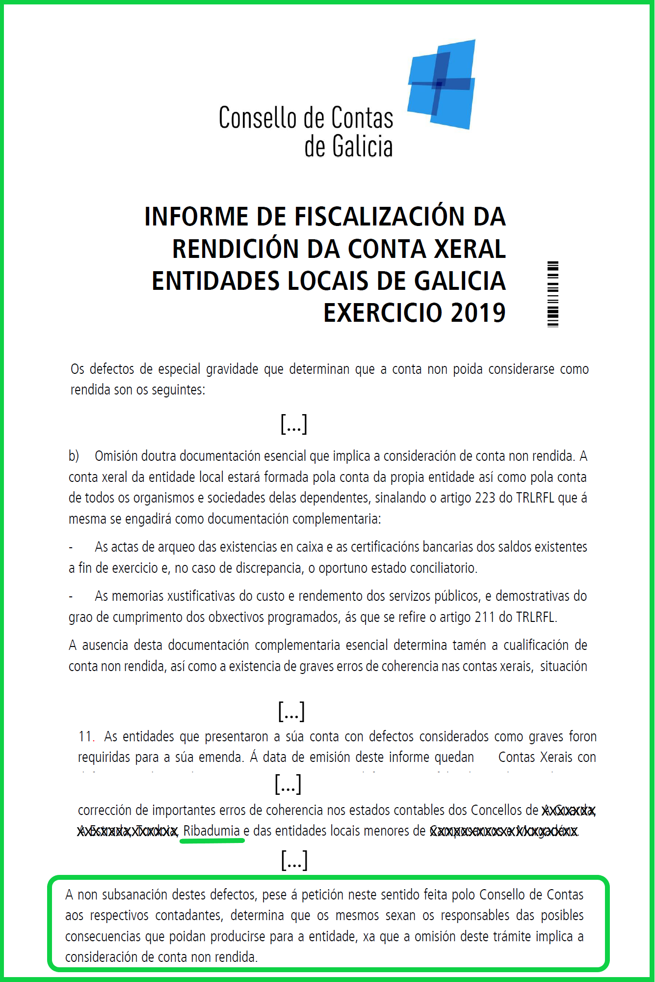 A sentenza do Consello de Contas é clara, e literalmente di o seguinte: “A non subsanación destes defectos, pese á petición neste sentido feita polo Consello de Contas aos respectivos contadantes, determina que os mesmos sexan os responsables das posibles consecuencias que poidan producirse para a entidade, xa que a omisión deste trámite implica a consideración de conta non rendida”.