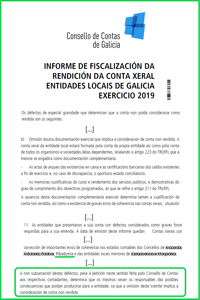 - O goberno local non presentou correctamente o resultado contable do ano 2019 ante o Consello de Contas de Galicia, nin respondeu aos requirimentos desta entidade.