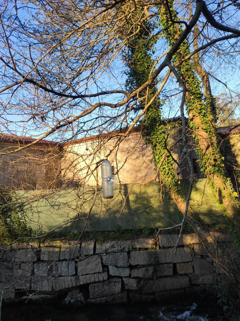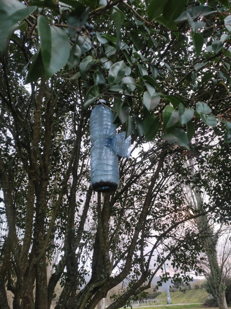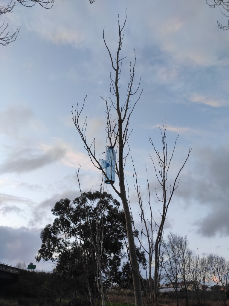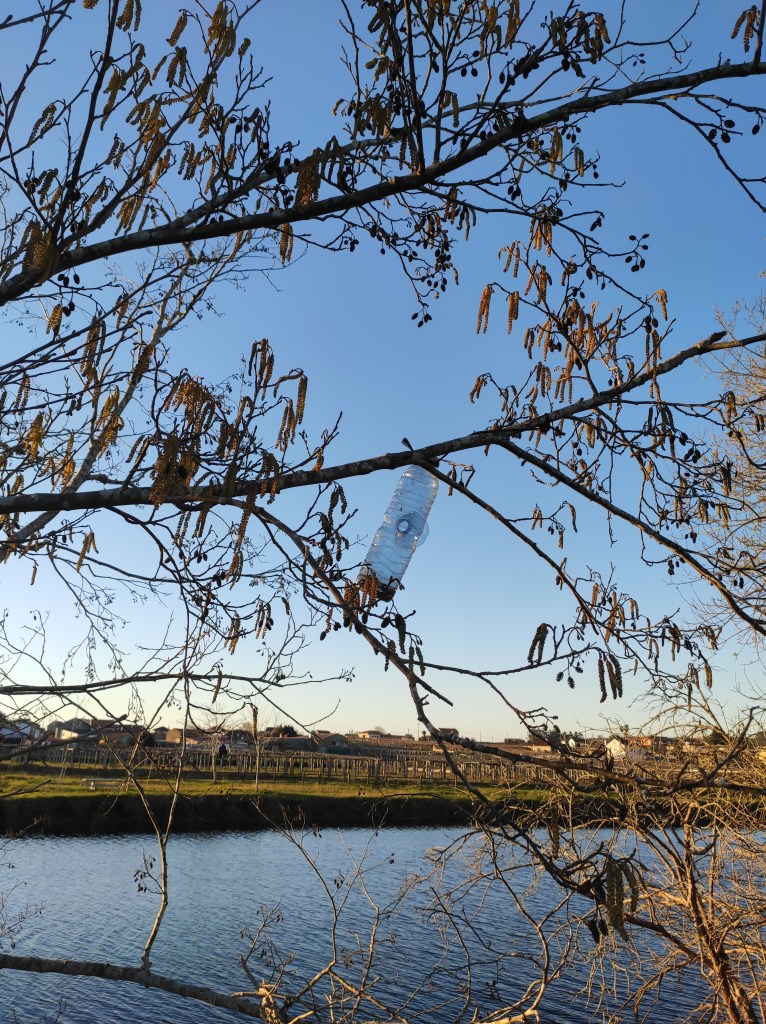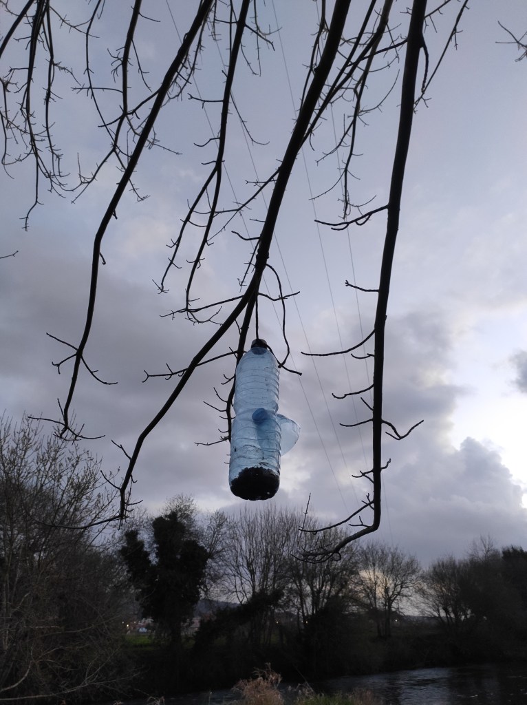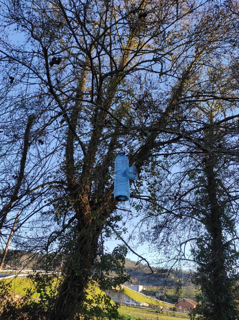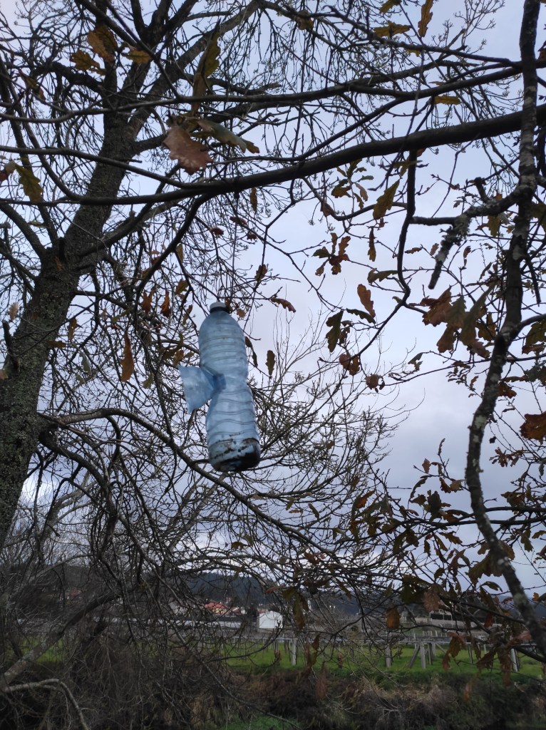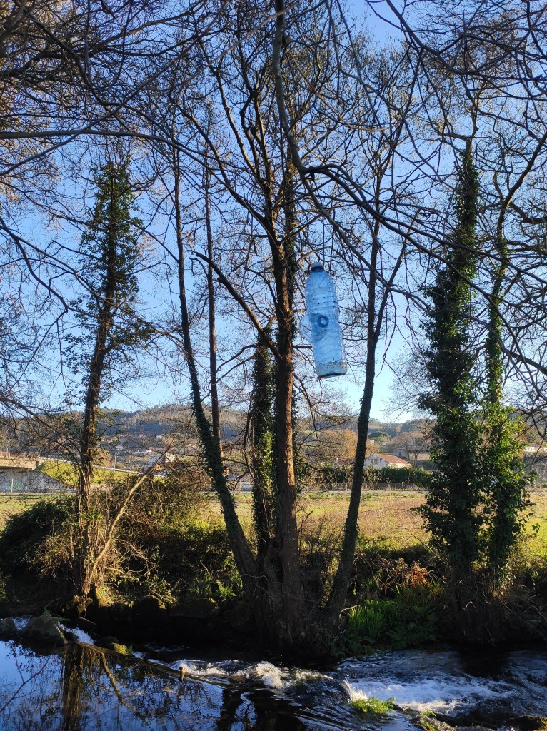 So no tramo ribadumiense da variante espiritual esta semana pasada fotografamos máis de un cento desas trampas, algunhas de anos anteriores, colgadas das árbores e agardando, aparentemente a que o vento remate de romper os cordeis que as sosteñen para ir rematar ao río. A esas hai que sumarlle as colocadas noutras zonas verdes do concello, que tampouco se retiraron.