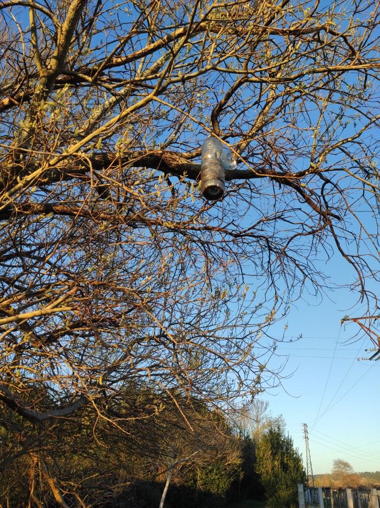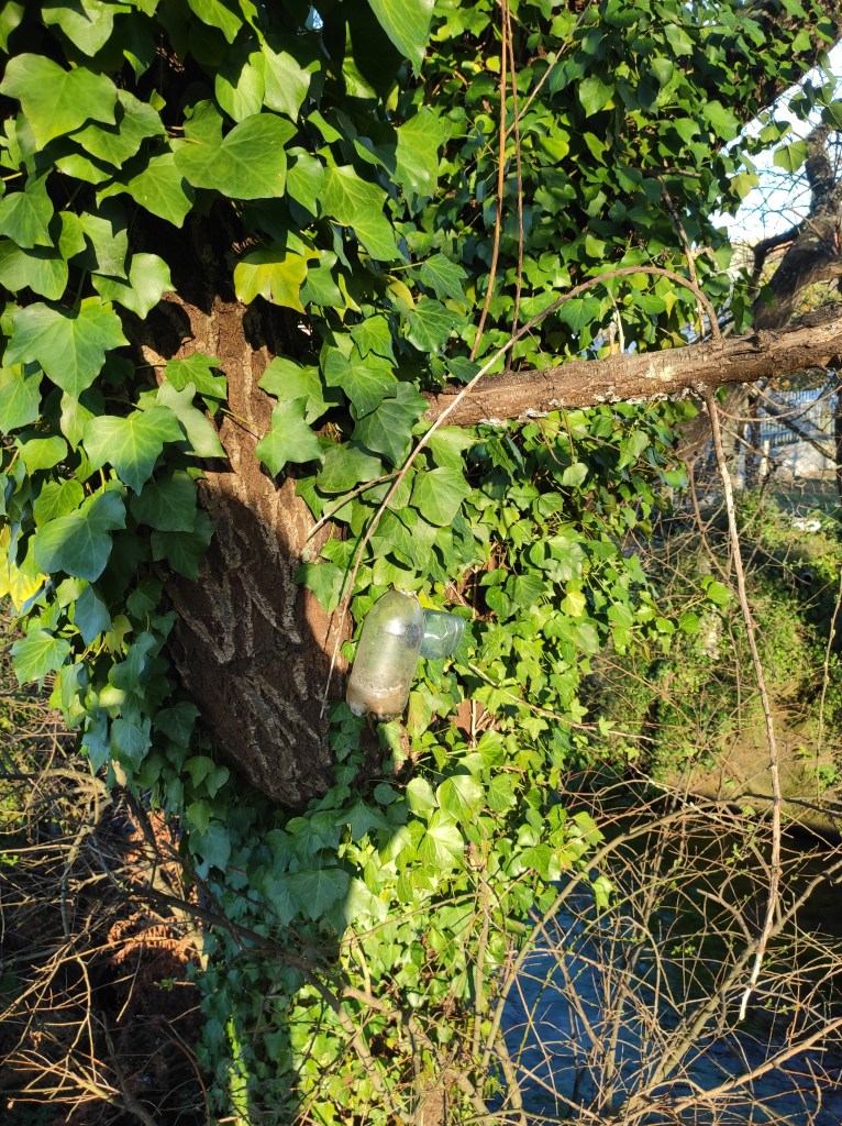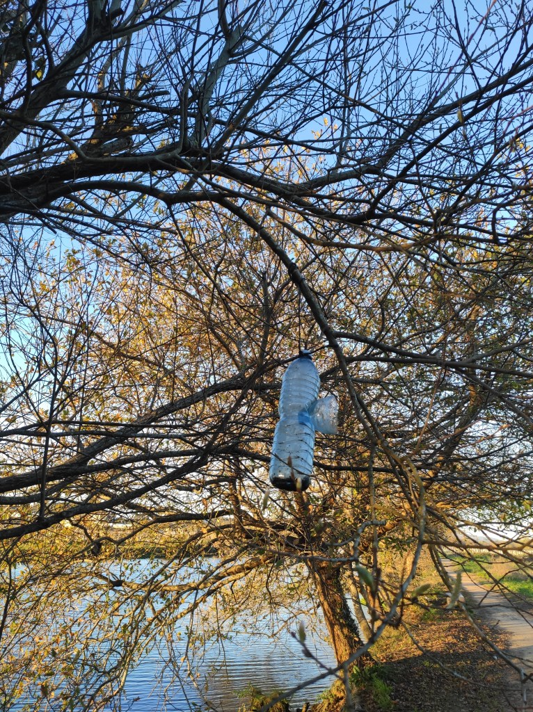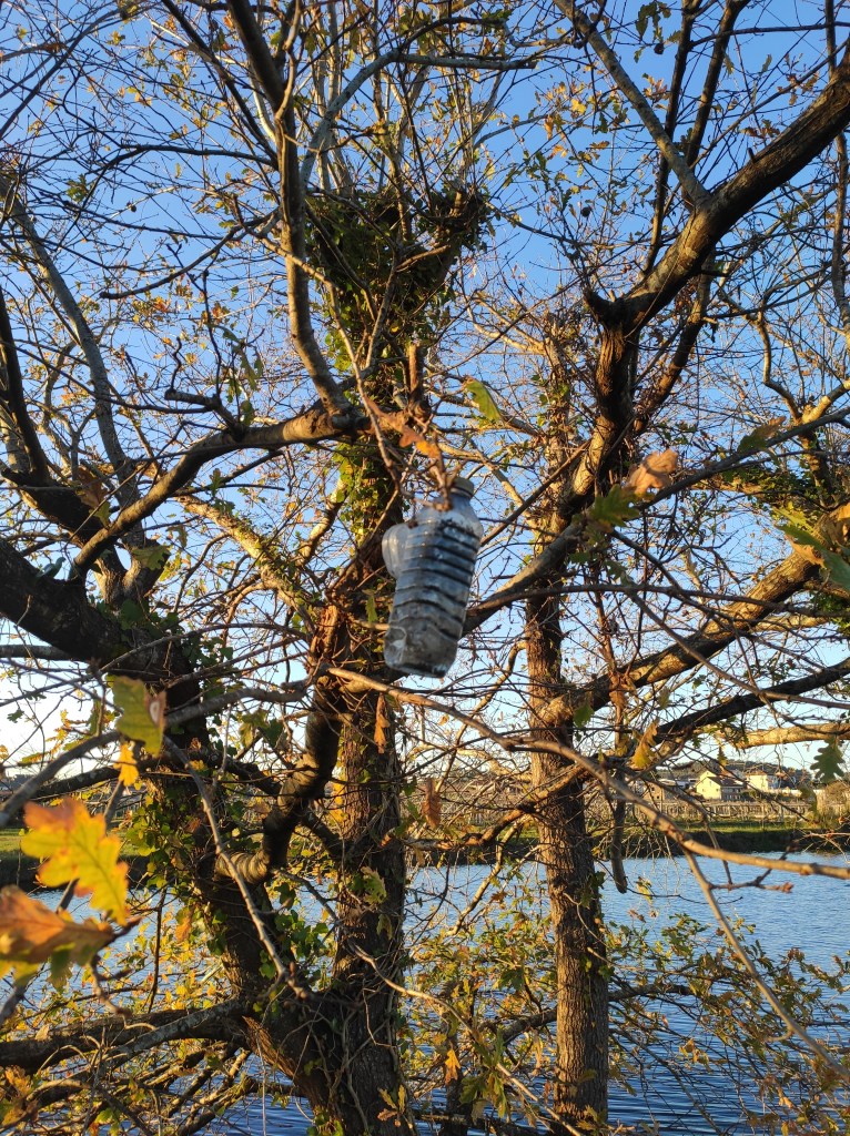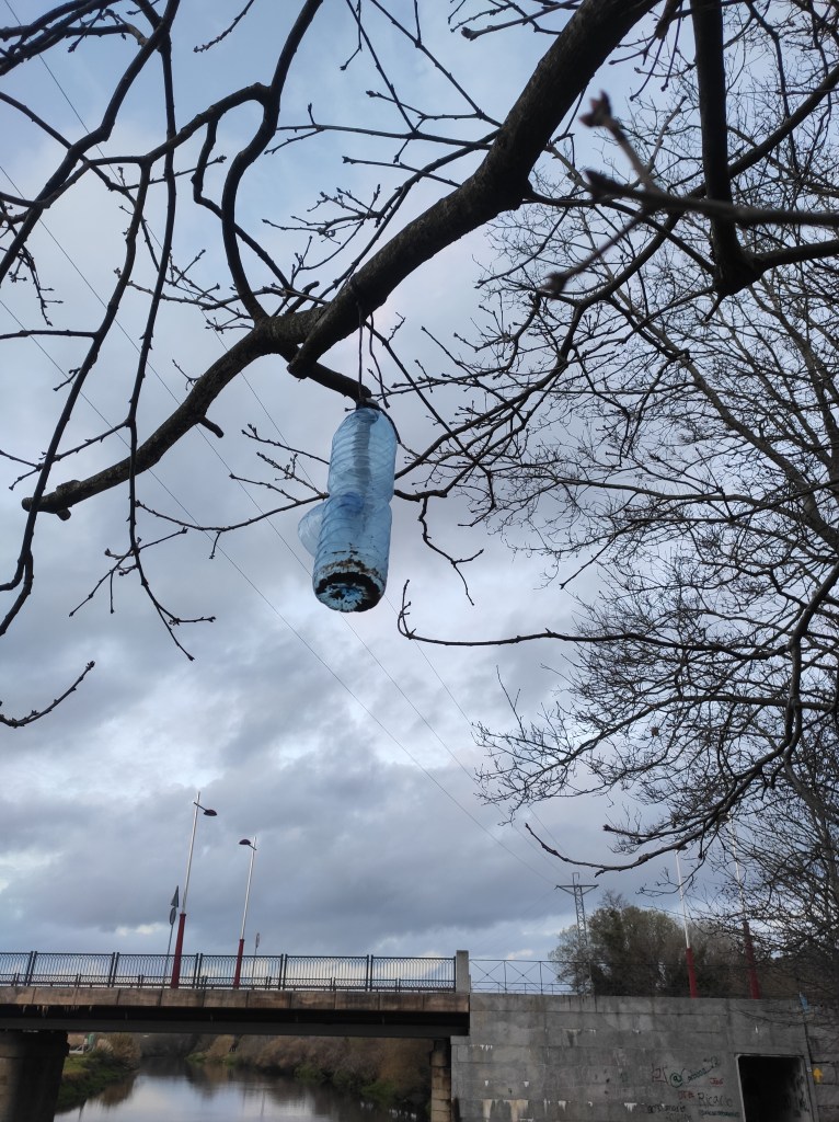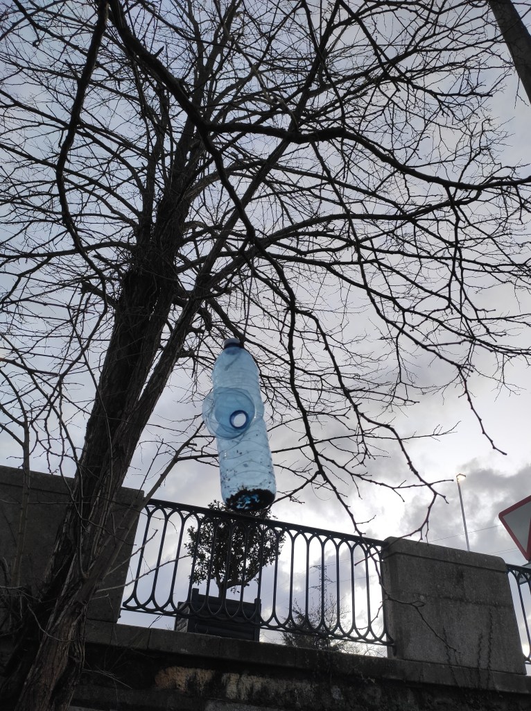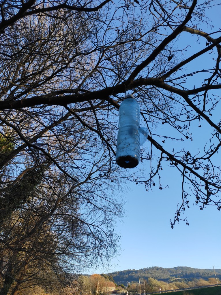 So no tramo ribadumiense da variante espiritual esta semana pasada fotografamos máis de un cento desas trampas, algunhas de anos anteriores, colgadas das árbores e agardando, aparentemente a que o vento remate de romper os cordeis que as sosteñen para ir rematar ao río. A esas hai que sumarlle as colocadas noutras zonas verdes do concello, que tampouco se retiraron.
