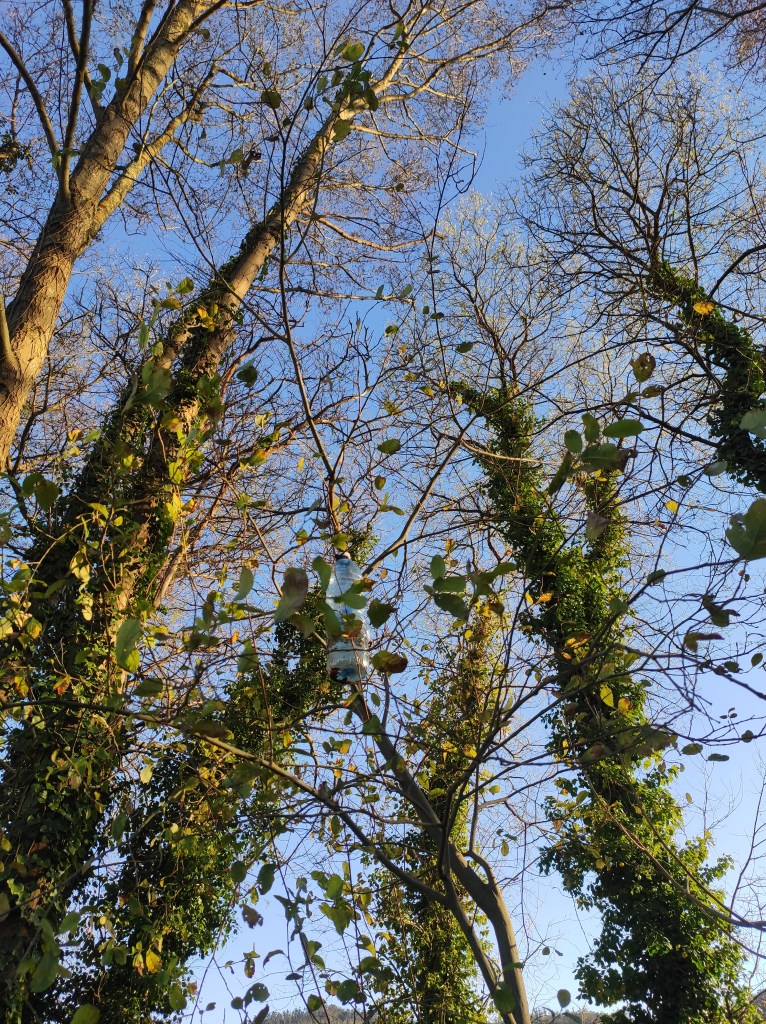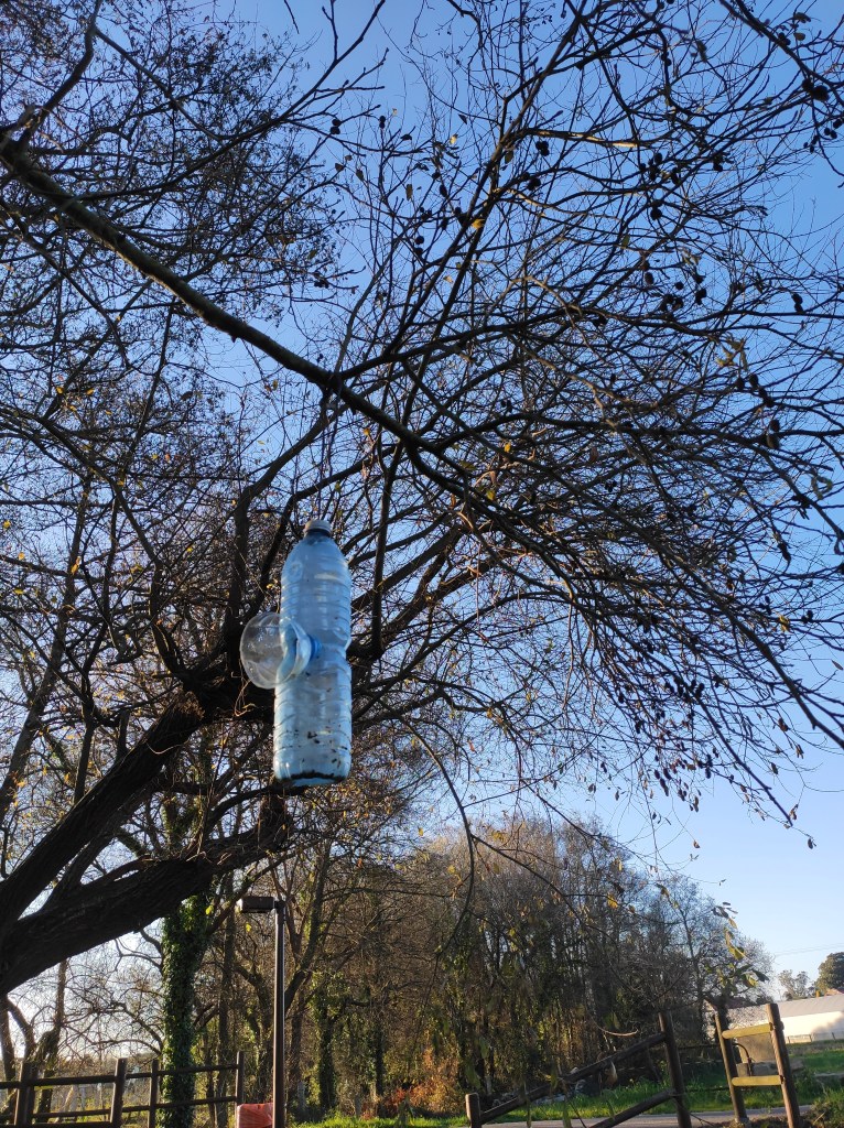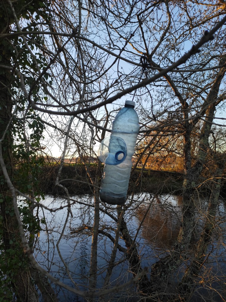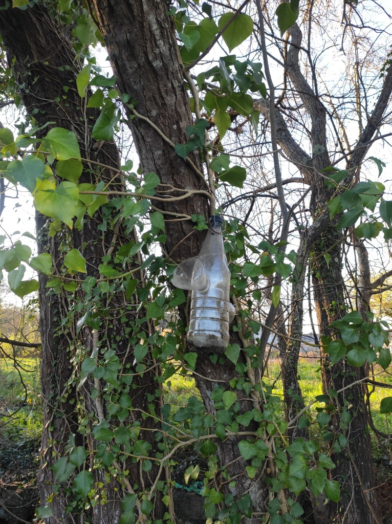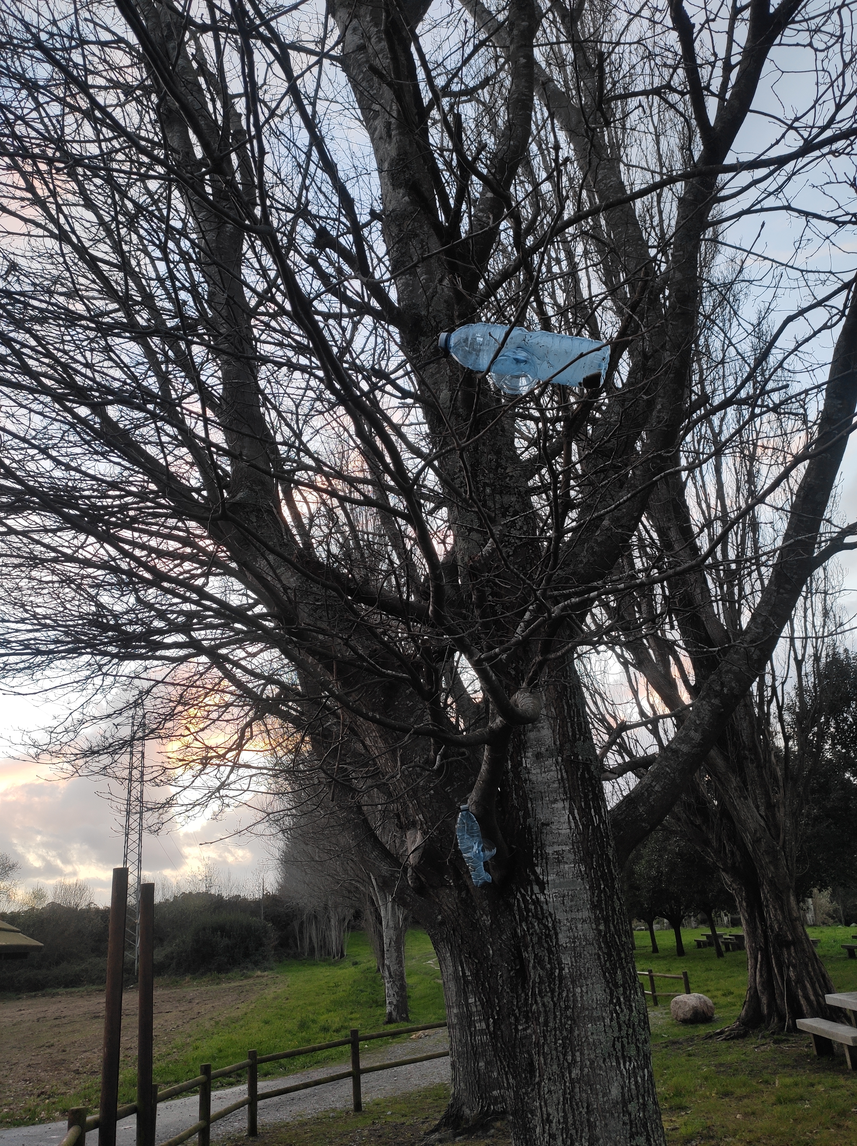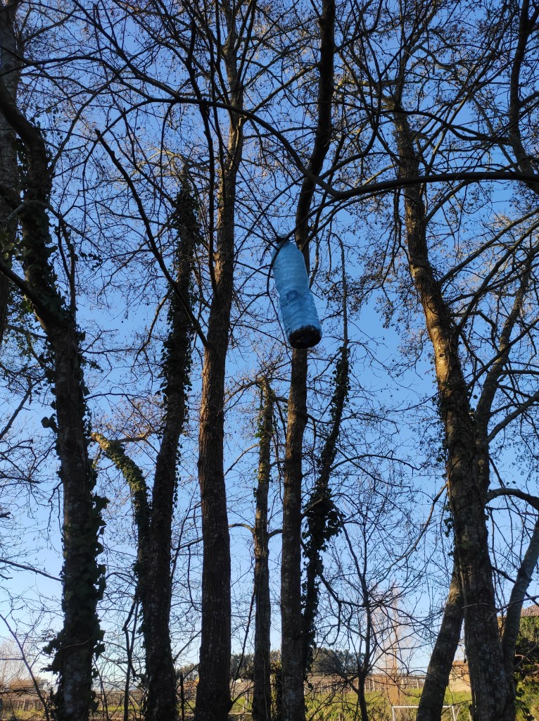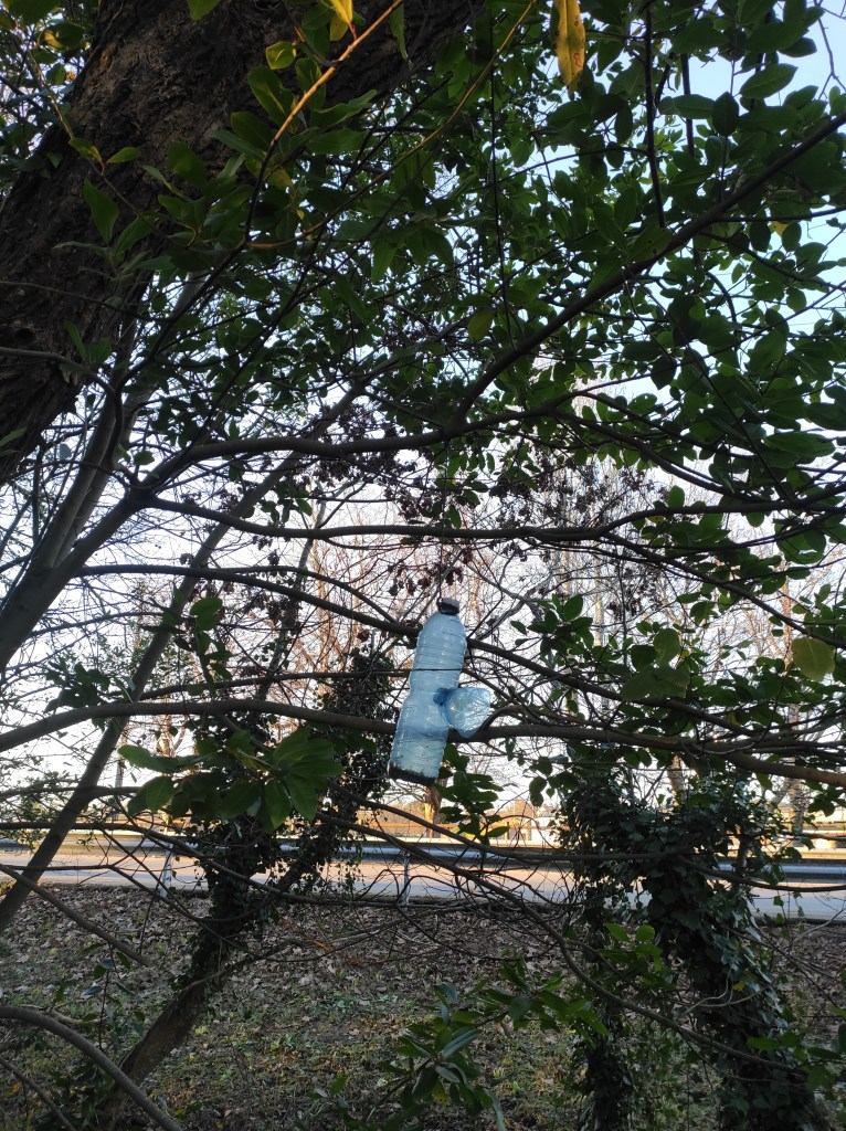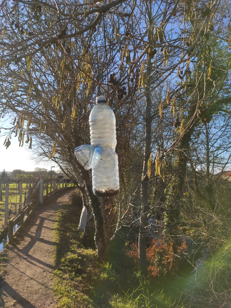 So no tramo ribadumiense da variante espiritual esta semana pasada fotografamos máis de un cento desas trampas, algunhas de anos anteriores, colgadas das árbores e agardando, aparentemente a que o vento remate de romper os cordeis que as sosteñen para ir rematar ao río. A esas hai que sumarlle as colocadas noutras zonas verdes do concello, que tampouco se retiraron.