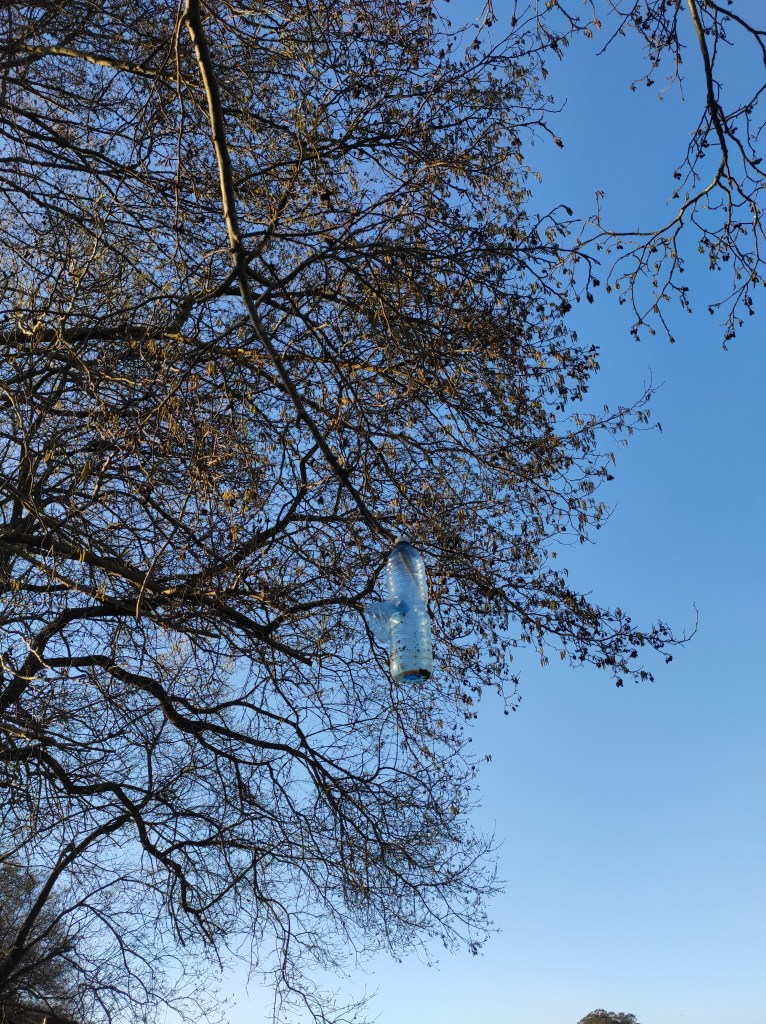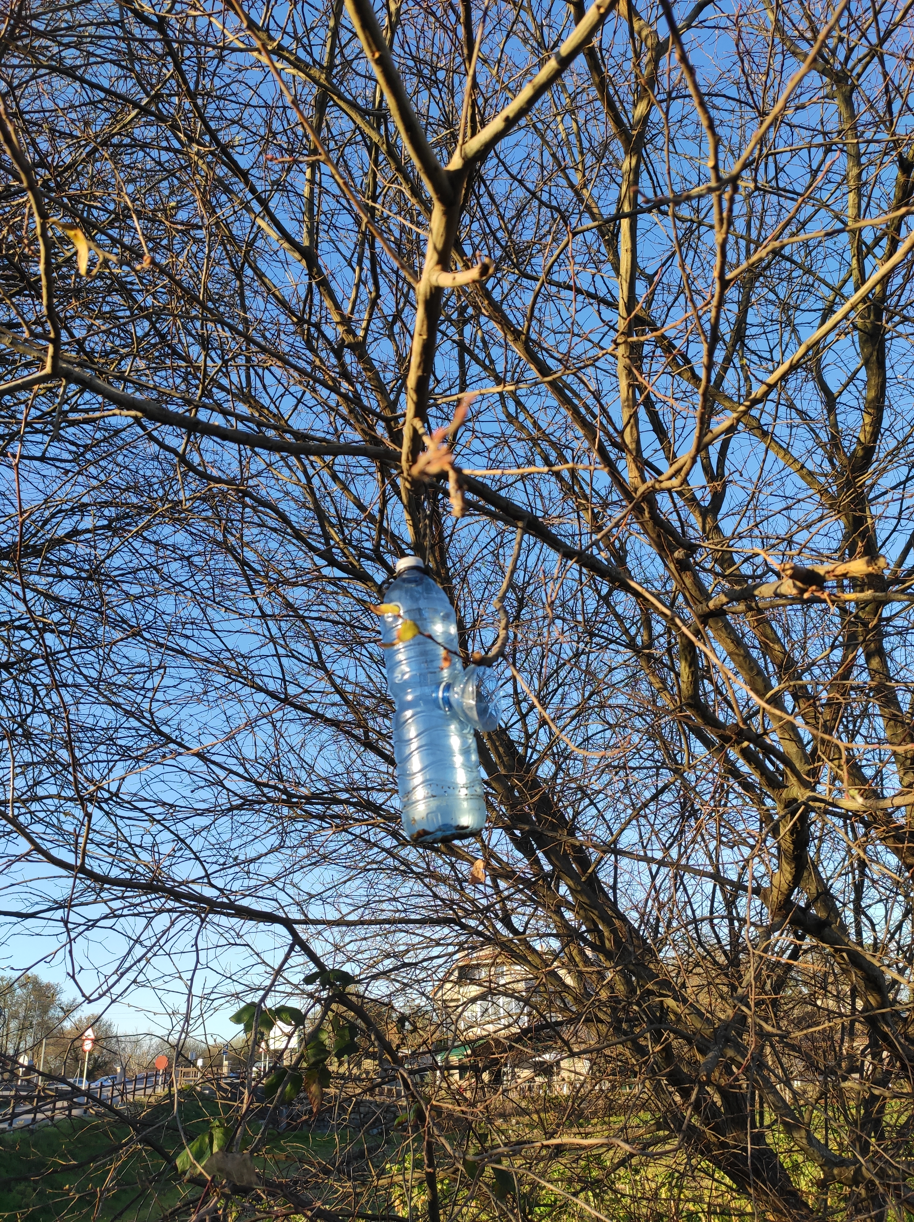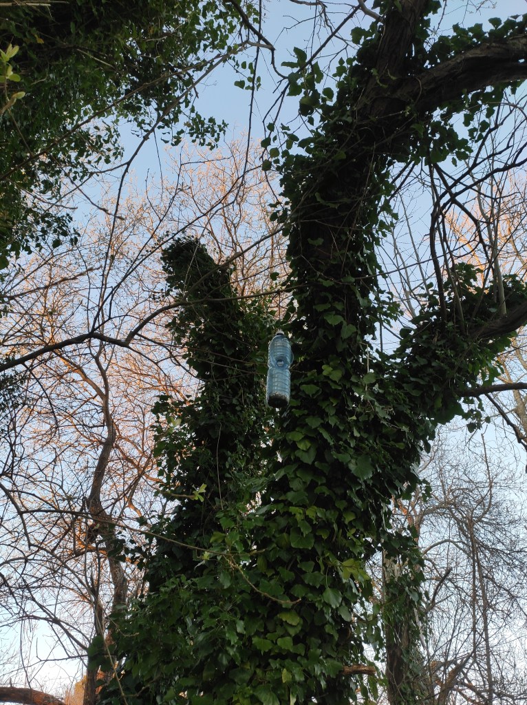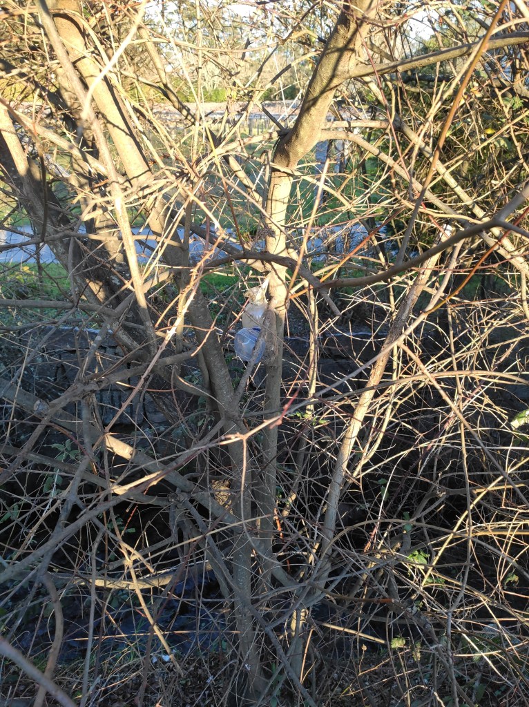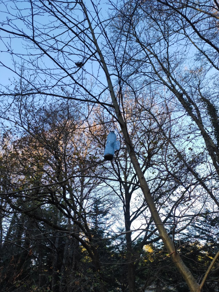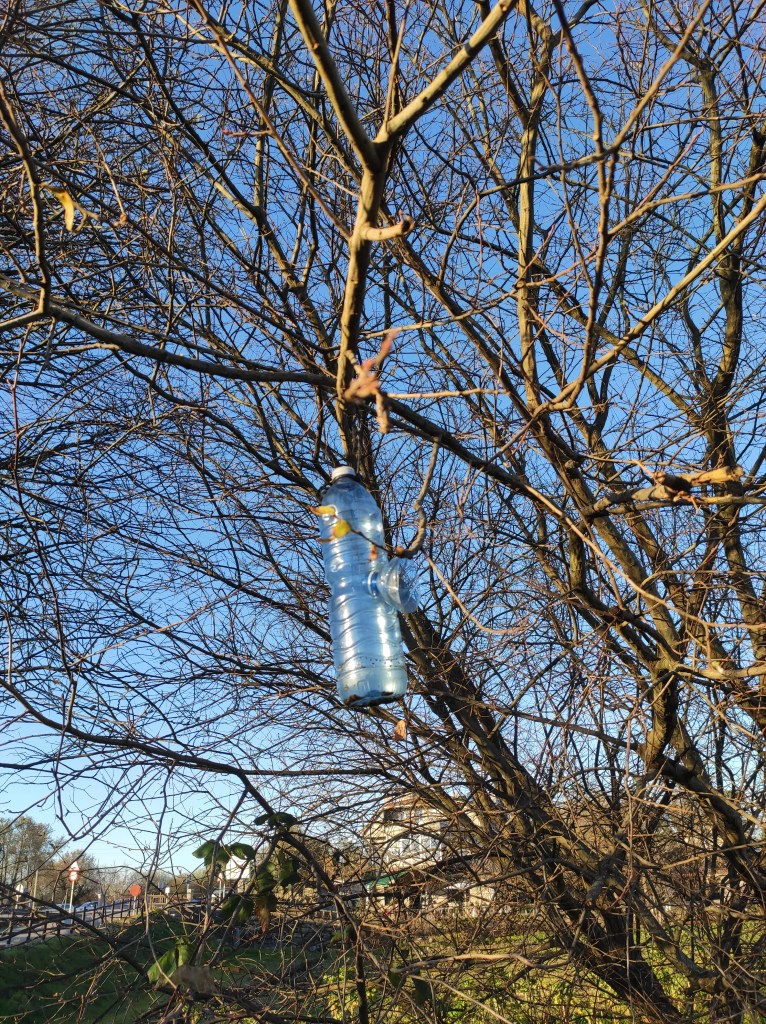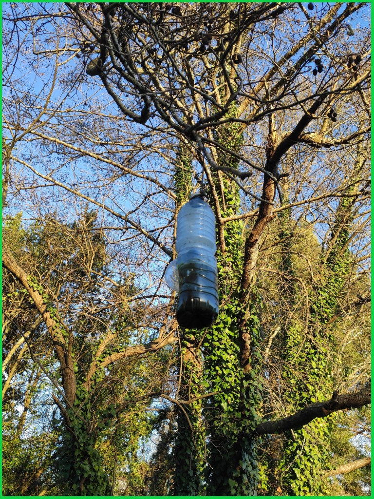 So no tramo ribadumiense da variante espiritual esta semana pasada fotografamos máis de un cento desas trampas, algunhas de anos anteriores, colgadas das árbores e agardando, aparentemente a que o vento remate de romper os cordeis que as sosteñen para ir rematar ao río. A esas hai que sumarlle as colocadas noutras zonas verdes do concello, que tampouco se retiraron.