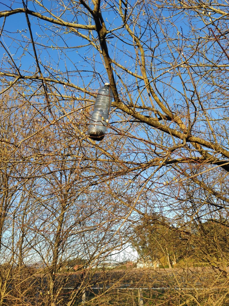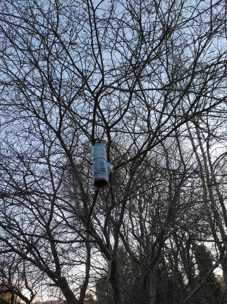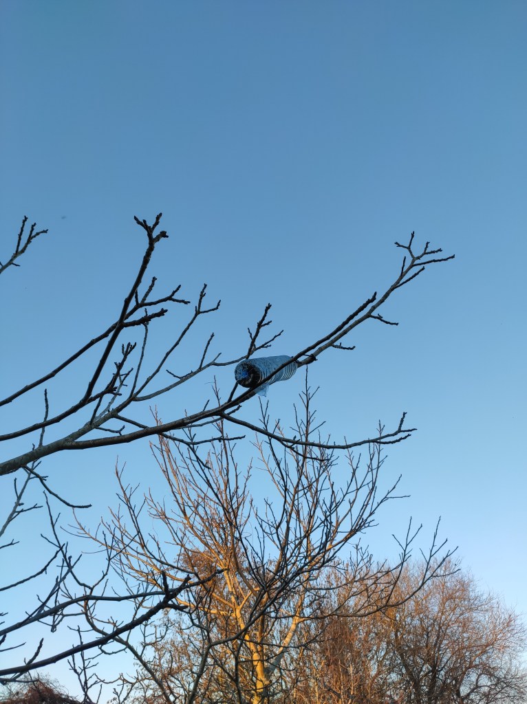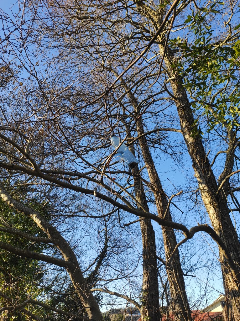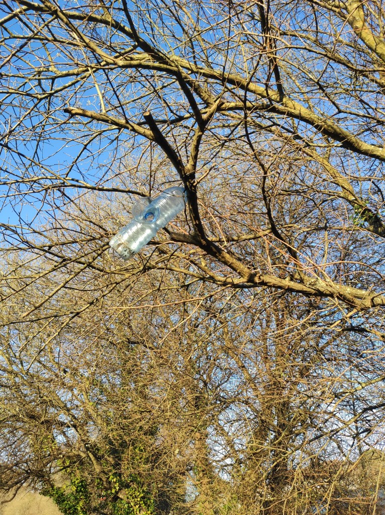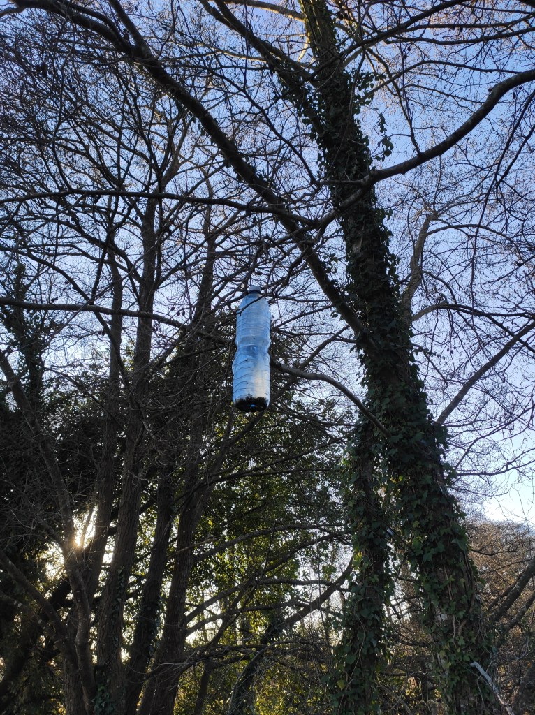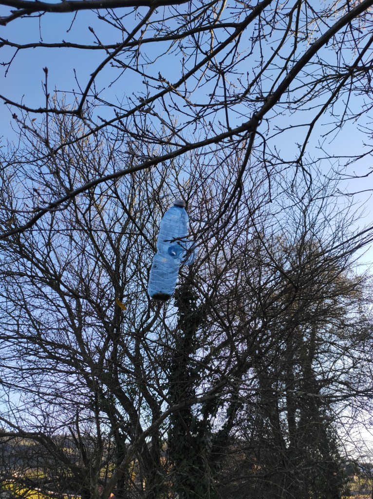 So no tramo ribadumiense da variante espiritual esta semana pasada fotografamos máis de un cento desas trampas, algunhas de anos anteriores, colgadas das árbores e agardando, aparentemente a que o vento remate de romper os cordeis que as sosteñen para ir rematar ao río. A esas hai que sumarlle as colocadas noutras zonas verdes do concello, que tampouco se retiraron.