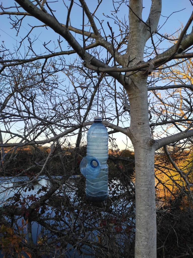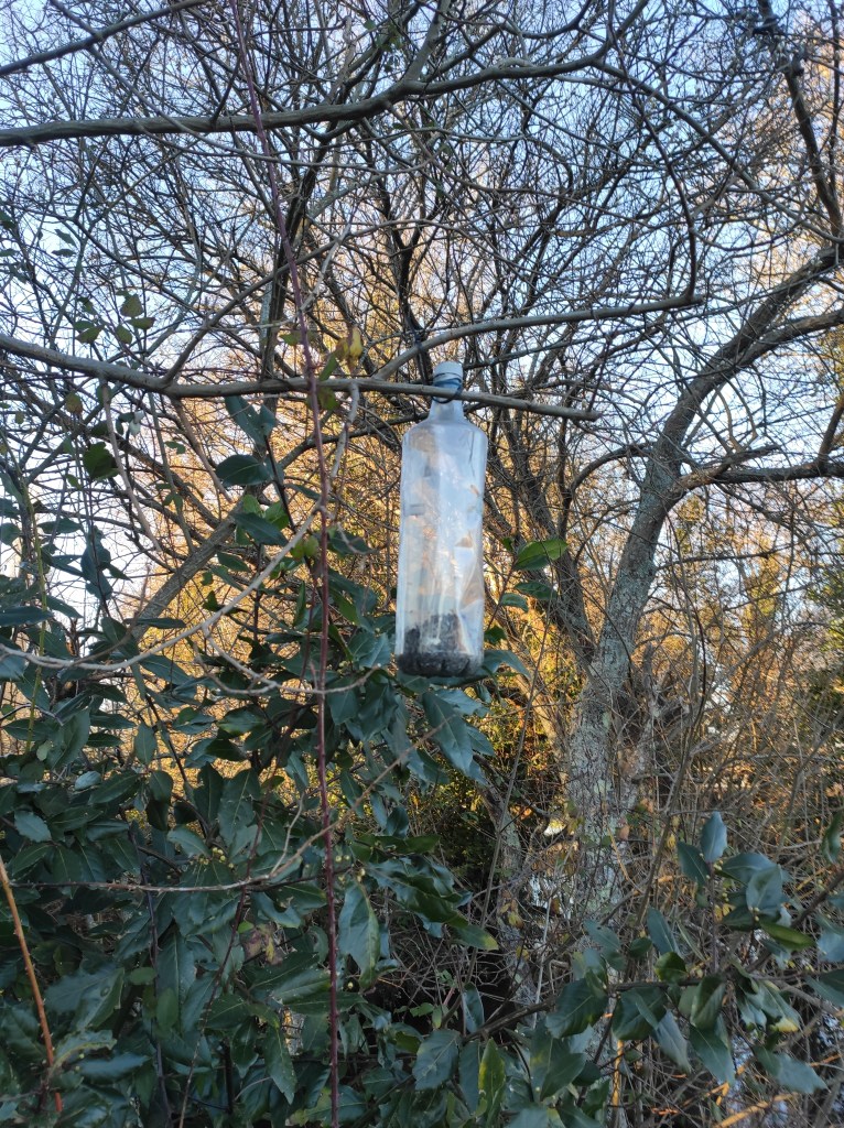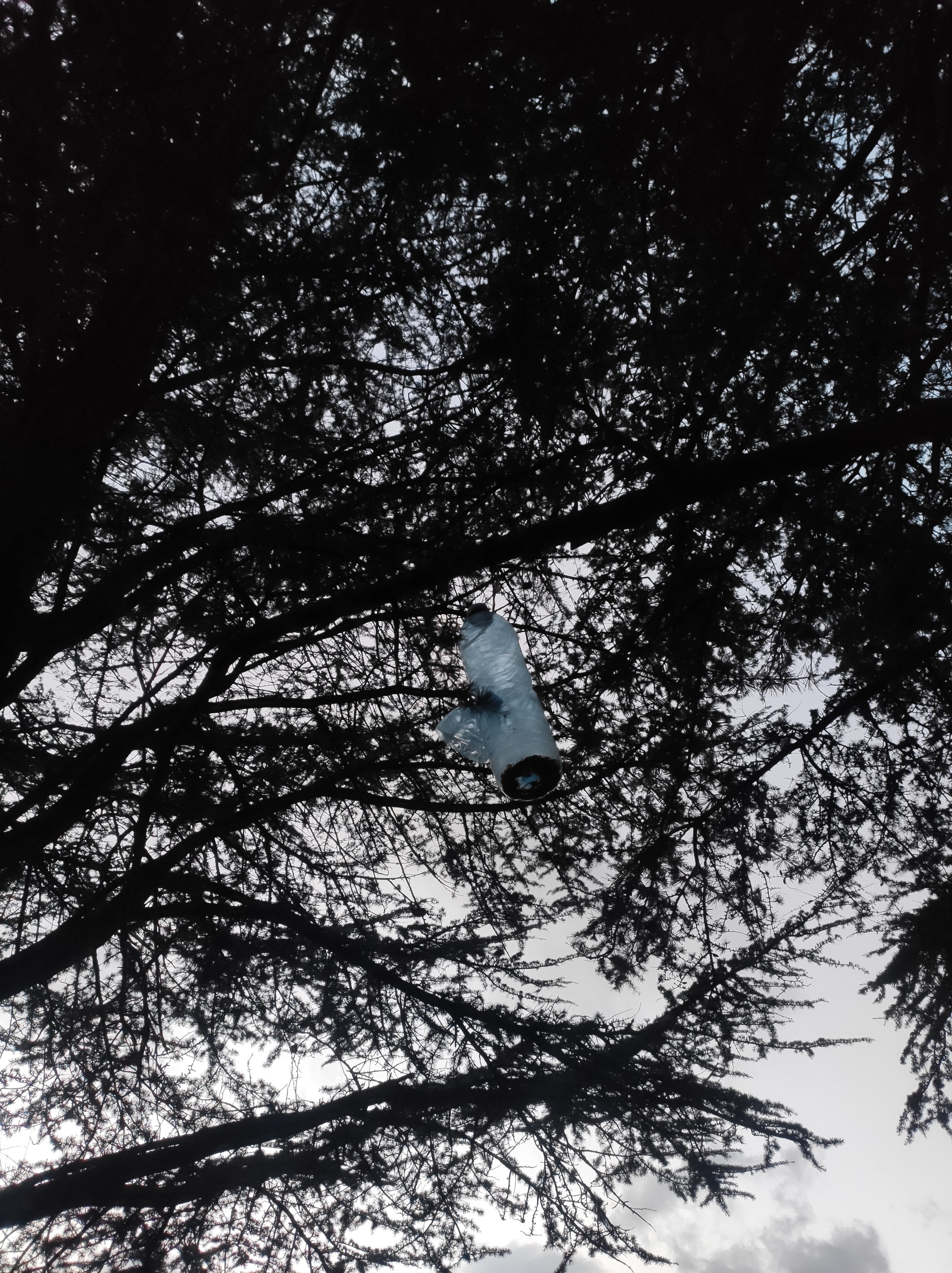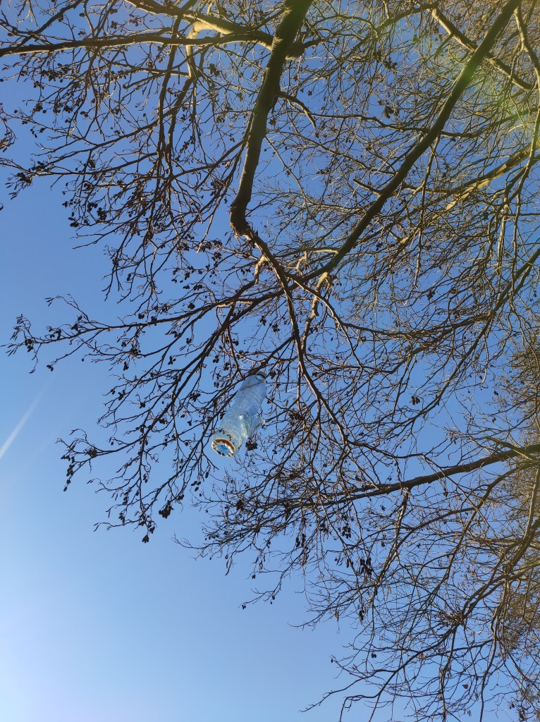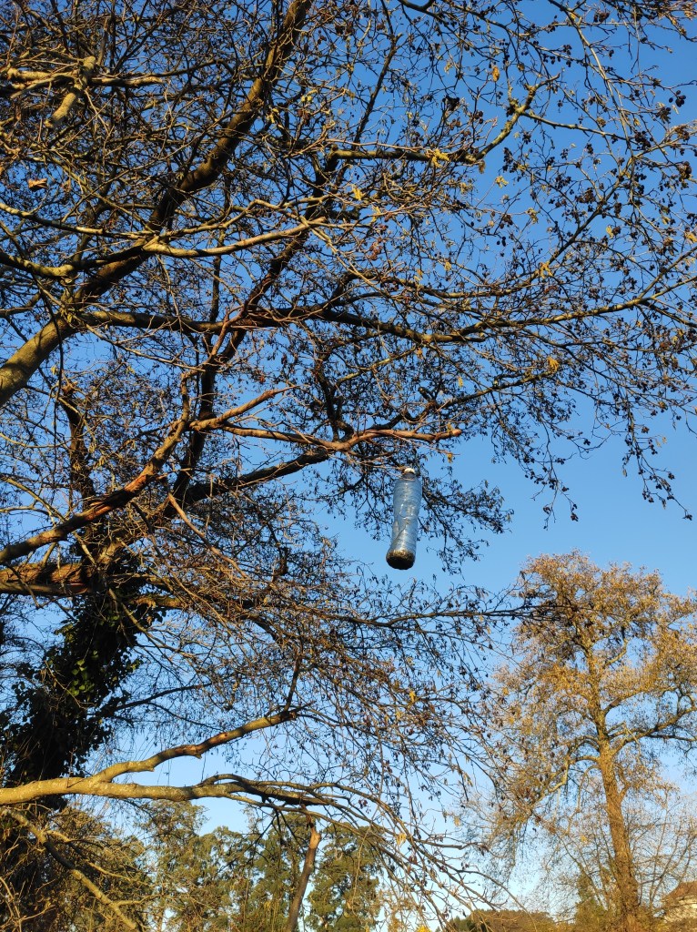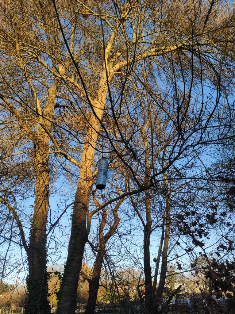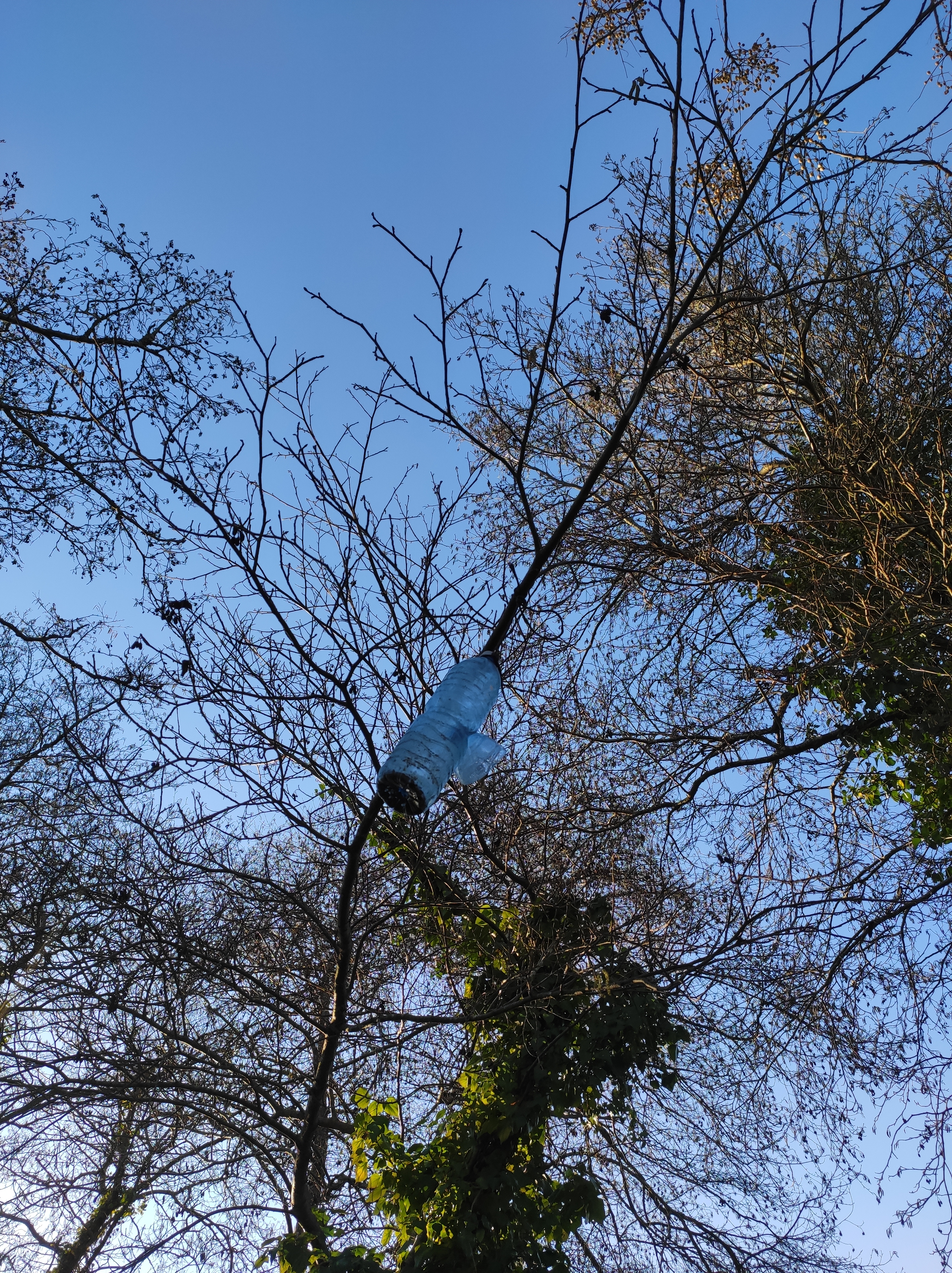 So no tramo ribadumiense da variante espiritual esta semana pasada fotografamos máis de un cento desas trampas, algunhas de anos anteriores, colgadas das árbores e agardando, aparentemente a que o vento remate de romper os cordeis que as sosteñen para ir rematar ao río. A esas hai que sumarlle as colocadas noutras zonas verdes do concello, que tampouco se retiraron.