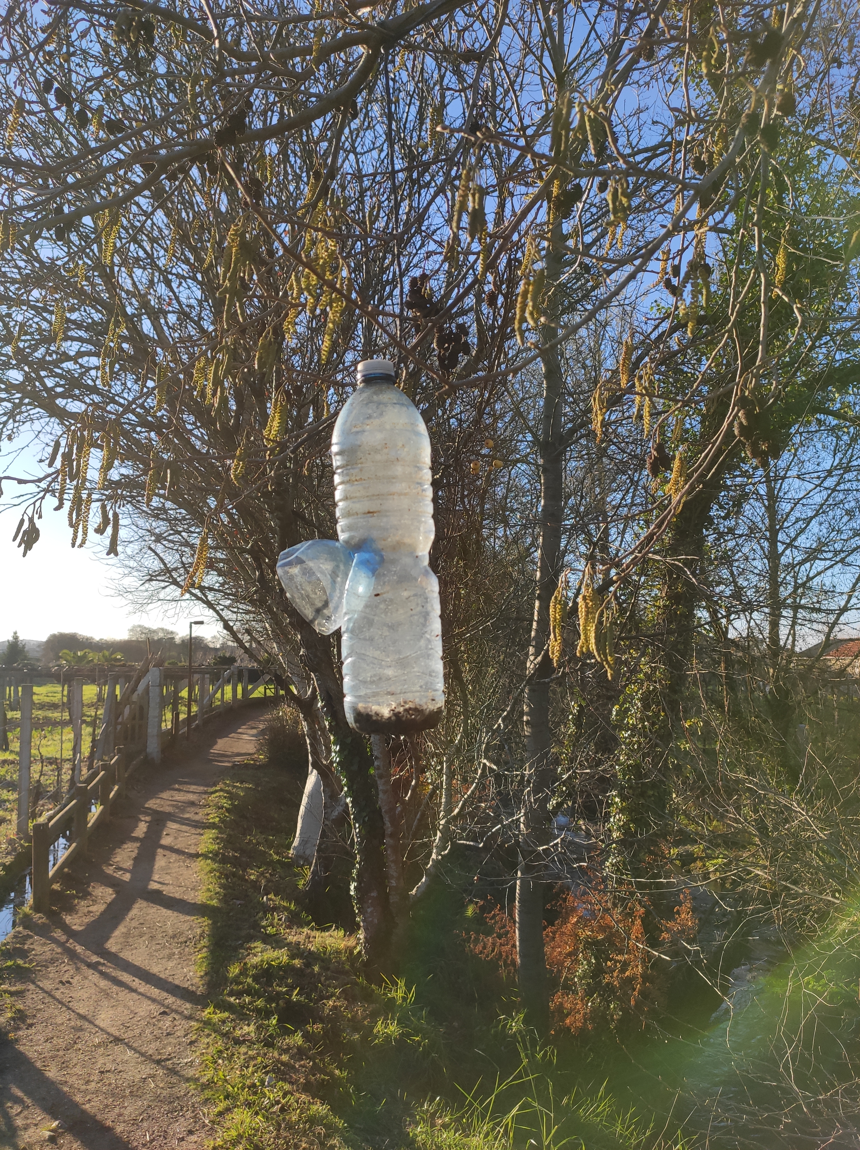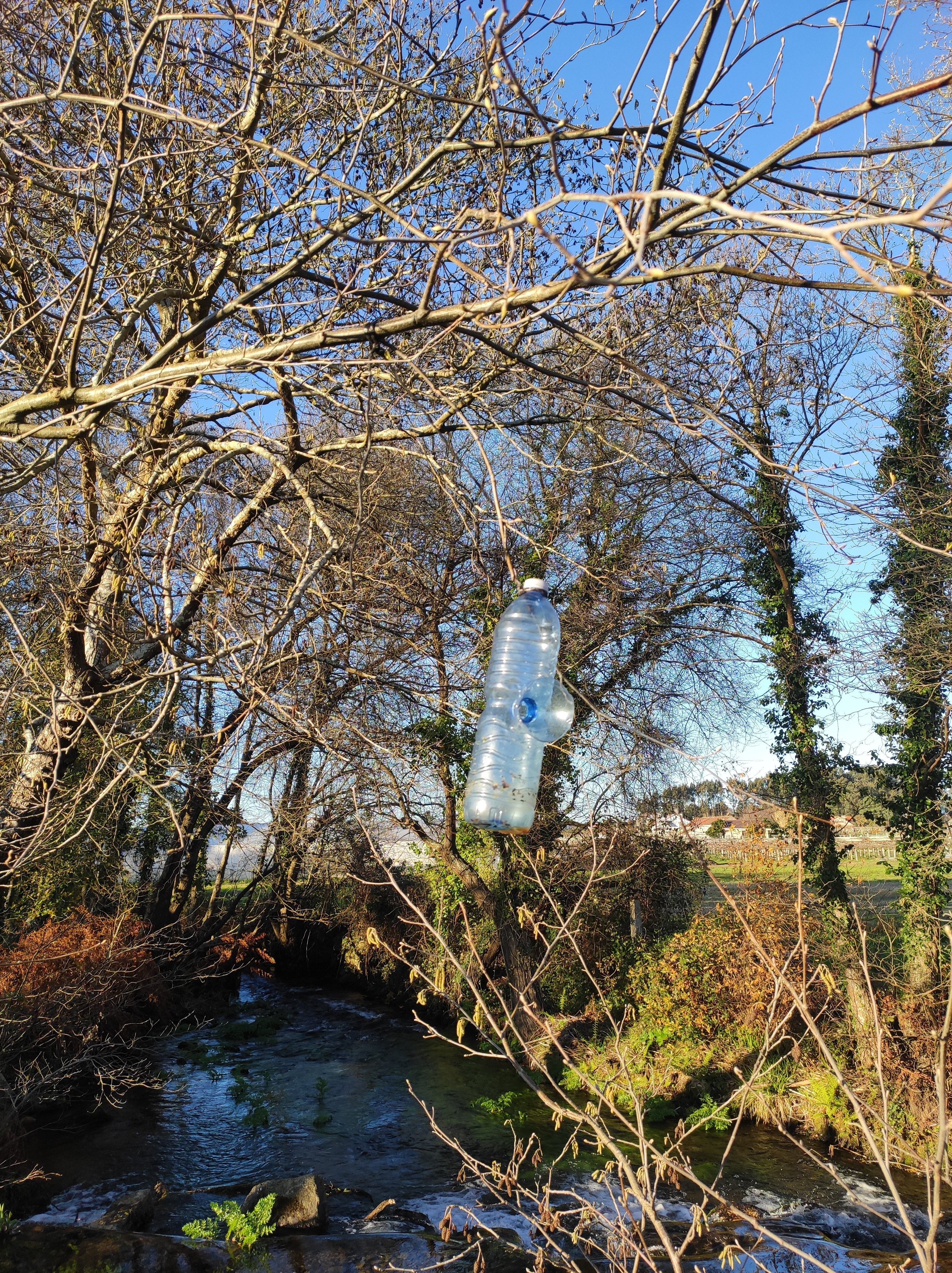 - Máis dun cento de trampas valeiras e sen uso colgan das árbores na senda fluvial, e se non se retiran remataran no río, todo un atentado medioambiental.