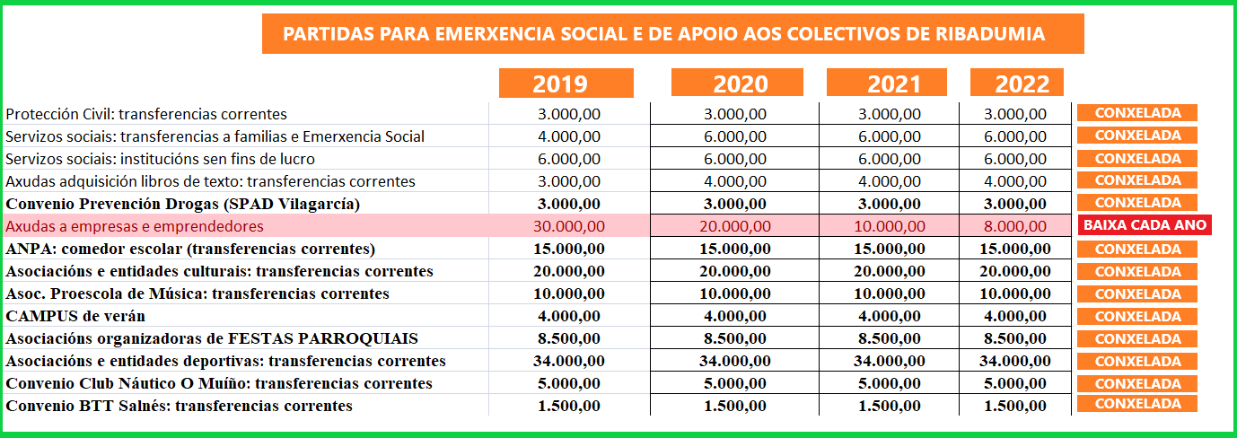 Por partidas, resulta fácil de resumir: fican conxeladas todas as partidas de axudas a colectivos sociais, deportivos e culturais, e de política social. Só se inclúe a maiores unha axuda para o transporte escolar do CRA, coa que se pretende tapar as queixas polo uso de recursos públicos en favorecer a dúas familias usuarias do CRA que cada día teñen un servizo personalizado de transporte. Seguimos sen ampliar os servizos de conciliación, nin moito menos dotalos no CRA, como nós levamos propoñendo anos.