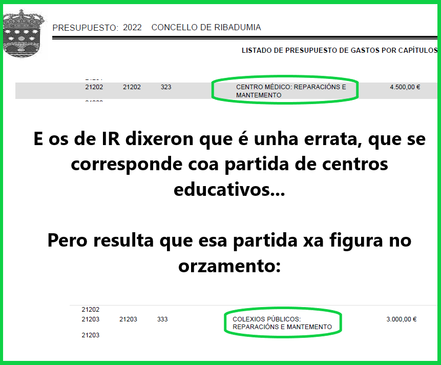 Por último, non podemos aceptar un orzamento que expoña claramente partidas falsas, como as que neste caso se inclúen para o mantemento do centro se saúde, onde o Concello leva catro anos sen tres competencias. E o ano pasado podía pasar por un erro, pero ese ano é evidente que se inclúen a propósito, e ademais auméntandoas, seguramente co obxectivo de destinar eses fondos a outras cuestións que o alcalde oculta.