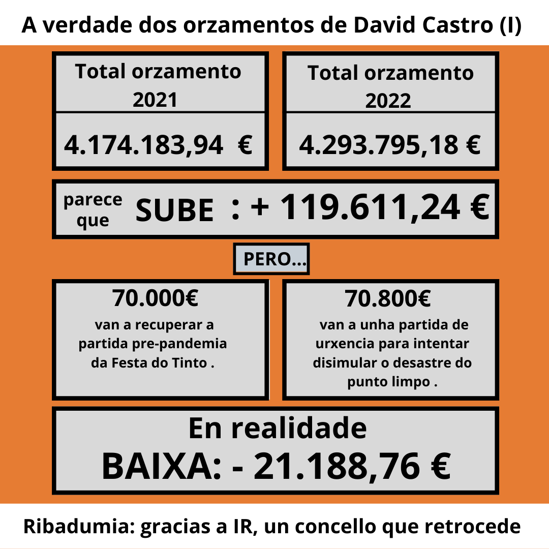 O pasado xoves debateuse en pleno o orzamento para o presente ano. De partida a proposta do goberno chegou a pleno sen diálogo coa oposición de ningún tipo, e iso que dende Somos Ribadumia como cada ano presentamos a nosa proposta para os orzamentos fai tres meses, con tempo de sobra a poder negociar partidas. Unha vez máis, David Castro nega aquilo do que pretende presumir.