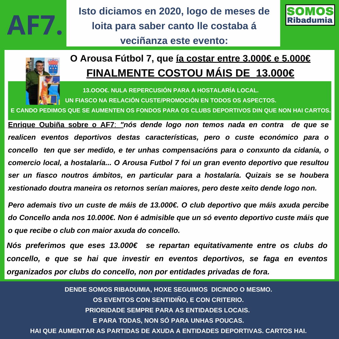 Para Oubiña “a nova non sorprende. Cando o pasado 3 de marzo debatemos o reparto de axudas a entidades o AF7 xa estivo presente, e aínda que David Castro non quixo admitir que xa estaba negociada a repetición deste evento, coas súas verbas e a súa defensa férrea dun evento que no 2019 foi un completo fiasco deixounos claro que este ano imos volver tirar cartos nun evento que a Ribadumia quedou claro que non lle aporta gran cousa”.