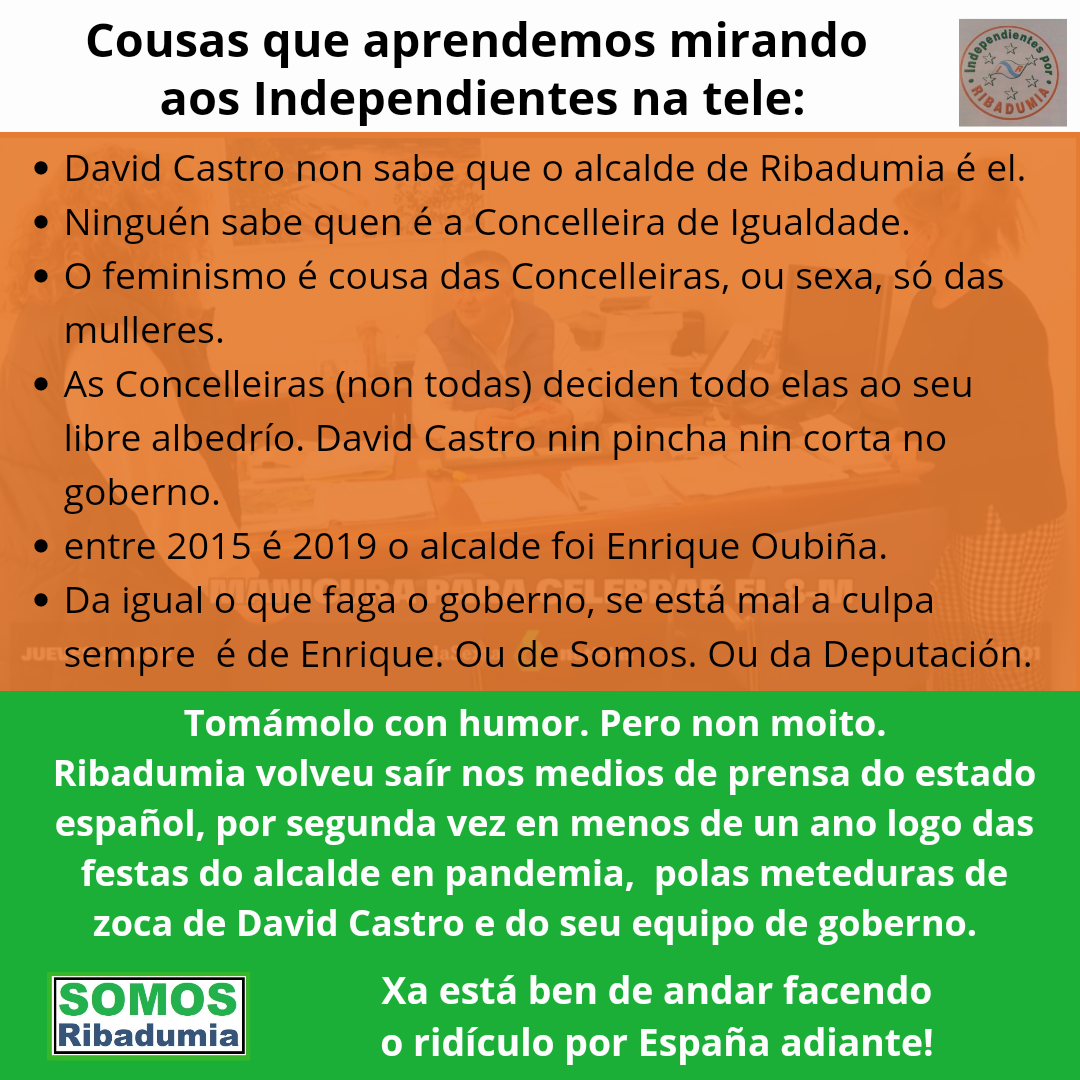 No ano 2018, o goberno que tiña ese momento Ribadumia, do que David Castro, a pesar de que agora non o recorde, e a maior parte do equipo actual dos Independientes formaban parte, tomou a decisión, certamente por iniciativa do noso voceiro Enrique Oubiña que era tamén responsable das áreas de política social, de modificar o enfoque que dende o goberno local se viña dando nos últimos anos ao Día da Muller e aos actos e actividades que se celebraban con motivo do 8M, e levouse a cabo a través de varias accións.