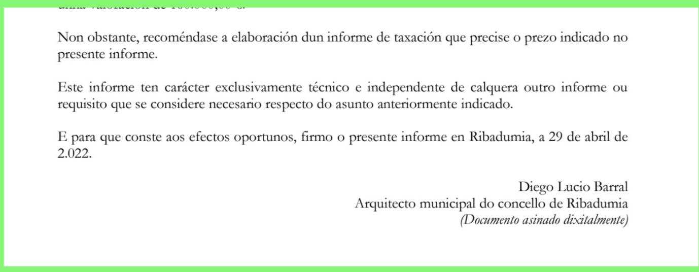De partida, tal como explica Enrique Oubiña “a compra vaise realizar sen ter unha tasación do terreo, algo que a día de hoxe non se lle ocorre a ninguén con dous dedos de fronte, sobre todo cando falamos deses prezos por metro cadrado. E non o décimos nós, para o pleno acompañouse o contrato de compra dun informe de idoneidade, claramente feito a medida do que lle interesaba por de relevancia ao goberno local – ata o punto de estar asinando despois de que o alcalde pechara o prezo da compra – pero no cal o propio técnico municipal recomendaba realizar unha tasación para determinar o valor real da parcela”.