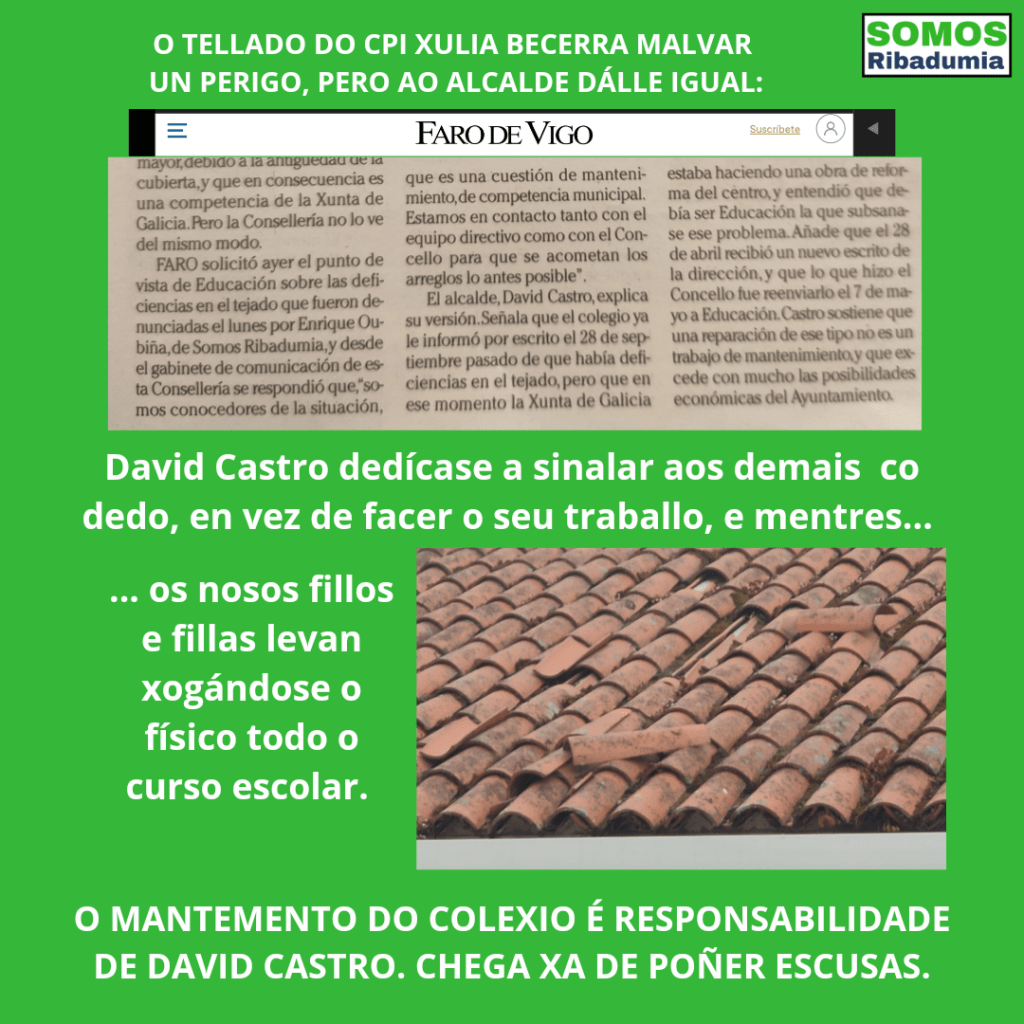O feito de que o tellado en xeral estea moi deteriorado é asunto distinto, pero David Castro que asuma os seus feitos. “Cando o pasado inverno o delegado do goberno veu facerse a foto logo dunha actuación que definiu como “integral”, David Castro aplaudiu coas orellas e dixo que todo estaba moi ben. Unicamente Somos Ribadumia puxo en tea de xuízo a obra feita e reclamou que se completaran as partes que quedaron sen facer, incluído o cambio de cuberta. E se David Castro estivo de acordo co feito, agora que se faga responsable e actúe en consecuencia, ou sexa que atenda as súas obrigas e deixe de poñer escusas”.