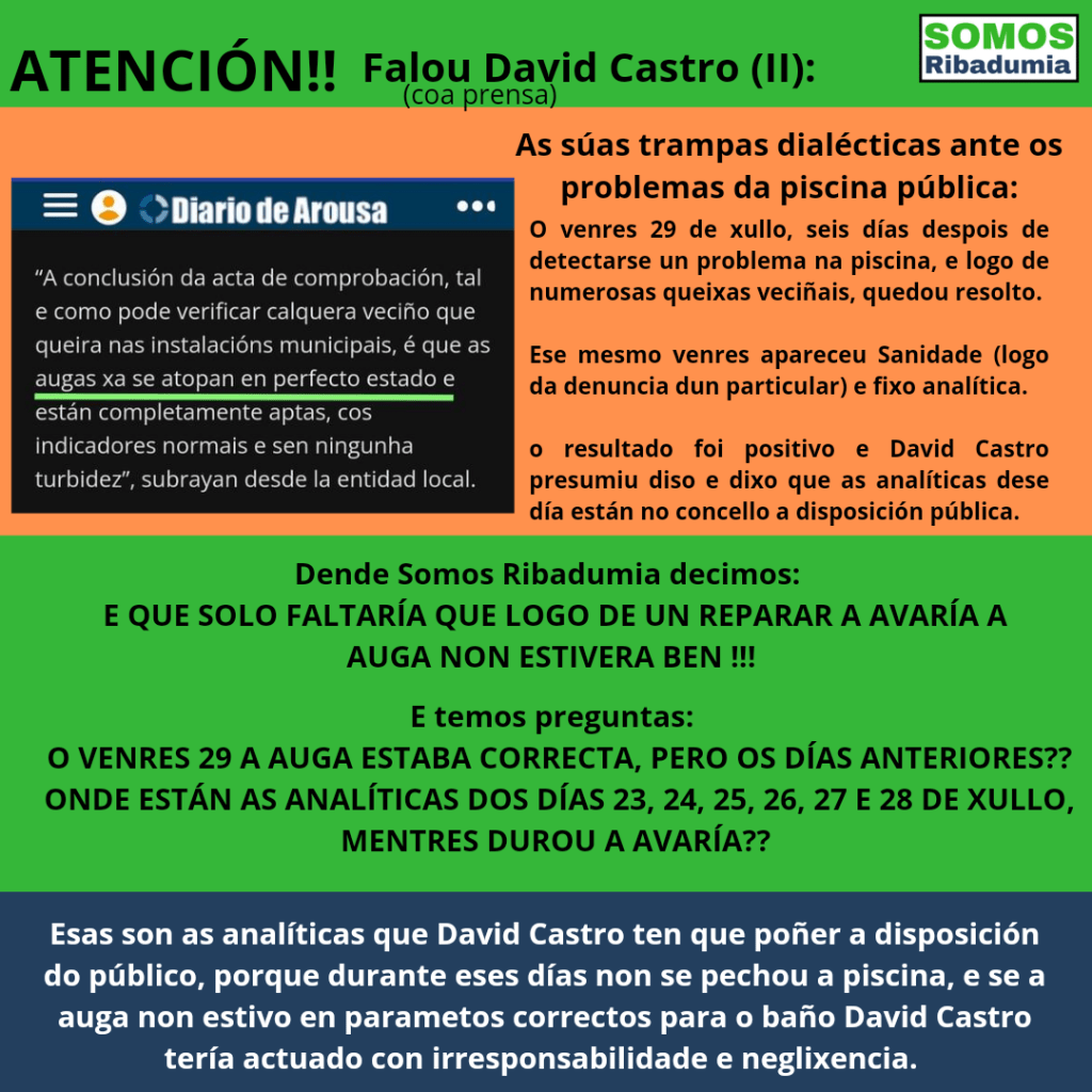 Algo parecido pasou coa piscina. David Castro dixo que este pasado venres viñeron inspectores de Sanidade analizar a auga. Non dixo que viñeron porque houbo denuncias de persoas usuarias da piscina. Dixo tamén que as analíticas deran correctamente e que “as augas xa se atopan en perfecto estado e están completamente aptas, cos indicadores normais e sen ningunha turbidez”. Dende Somos Ribadumia temos claro que se “xa son aptas”, e porque antes non o eran. En verbas de Oubiña “David Castro o que ten que facer para tranquilizar as nais e pais que van a piscina non é publicar os datos da auga da piscina do venres logo de reparar a avaría, que solo faltaría que ese día a auga non estivera correcta. O que ten que publicar son os parámetros dos días anteriores, e aclarar se a auga verde que tivo a piscina todos eses días era apta ou non apta para o baño, porque senon o era David Castro actuou con total neglixencia ao manter a piscina aberta”.