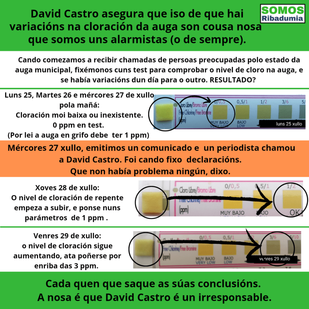 Dende Somos Ribadumia non estamos preocupados por esas ameazas. Preocúpanos máis a saúde da nosa veciñanza e a realidade dos feitos. Cando comezamos a recibir chamadas de persoas preocupadas porque a auga parecía saír dos grifos sen clorar e con sabor a terra, decidimos comprobar empiricamente se había variacións na cloración da auga. O resultado dos test de cloro realizados de xeito diario entre o luns e o venres da semana pasada, sen ser exactos en canto a cantidade de cloro na auga, si deixaron patente que entre o luns e o mércores – cando emitimos o comunicado relativo á cuestión – os niveis de cloro eran moi cercanos a cero, de feito os test marcaban como inexistente a presenza de cloro, cando o mínimo debería ser segundo o Real Decreto 140/2003 de 1 ppm. A partir do mércores, curiosamente, eses niveis foron subindo exponencialmente ata superar as 3 ppm no venres.