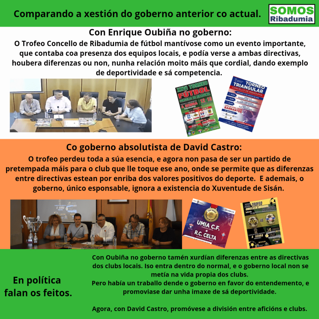 E non só iso. Dende Somos Ribadumia entendemos que habendo un novo club futbolístico, xa non diremos antes, pero unha vez superada a súa primeira tempada e xa asentado na competición deportiva, o normal sería que dende o goberno se lle dera a oportunidade de organizar o Trofeo Concello de Ribadumia este ano, para axudarlles no posible a saír adiante nestes primeiros momentos. Pero David Castro non só non tivo este xesto, senón que directamente ignorou a existencia deste club e da súa afición, como testemuñan as súas declaracións na presentación do Trofeo a semana pasada, onde non se fixo nin unha soa mención a este club, mentres se poñen escusas que ninguén creu para xustificar a ausencia do Umia no evento e a inexistente intermediación de David Castro para evitar este bochorno.