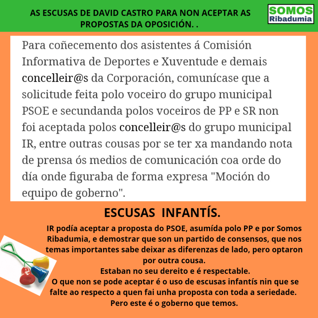 Tamén convén recordar que dende o PSOE propúxose que a moción fora asumida pola Corporación ao completo como moción conxunta. PP e Somos Ribadumia sumámonos a esa proposta pero IR negouse con argumentos absurdos e infantís, porque o que querían era un titular.