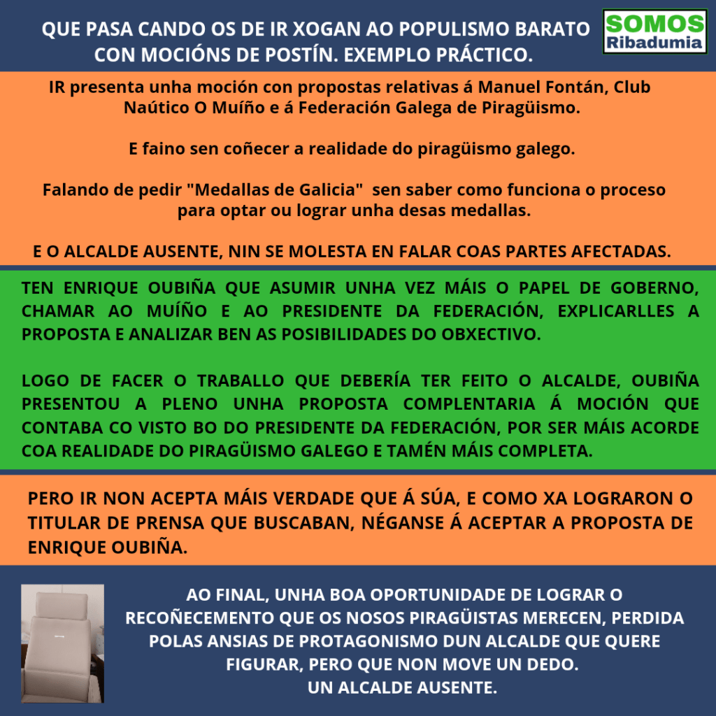 A proposta de acordo que trasladou ao Pleno foi a de “Propoñer a Manuel Fóntán e ao resto de integrantes da Federación Galega de Piragüismo dende a súa fundación, e en nome de todos eles, pasados e presentes, á Federación Galega de Piragüismo para ser distinguida coa medalla Galicia 2023, e deste xeito recoñecer o gran traballo que se ven realizando nesta modalidade deportiva por parte dos clubs galegos de piragüismo, e por suposto do club Ribadumiense O Muiño”. Esta proposta apenas modificaba o texto, pero permitíalle ter o contido necesario para que puidera ser asumida por todos os clubs de piragüismo de Galicia, e tamén polo Concellos, forzas políticas e outras entidades, e así poder darlle un pulo de cara a conseguir a mais que merecida a Medalla de Galicia, suposto obxectivo da moción, pero o goberno local desestimou a proposta porque polo visto Oubiña tiña que ter asumido o papel de goberno antes, comunicarse el coa Federación con máis tempo e pasarlle a proposta ao goberno dous ou tres días antes.