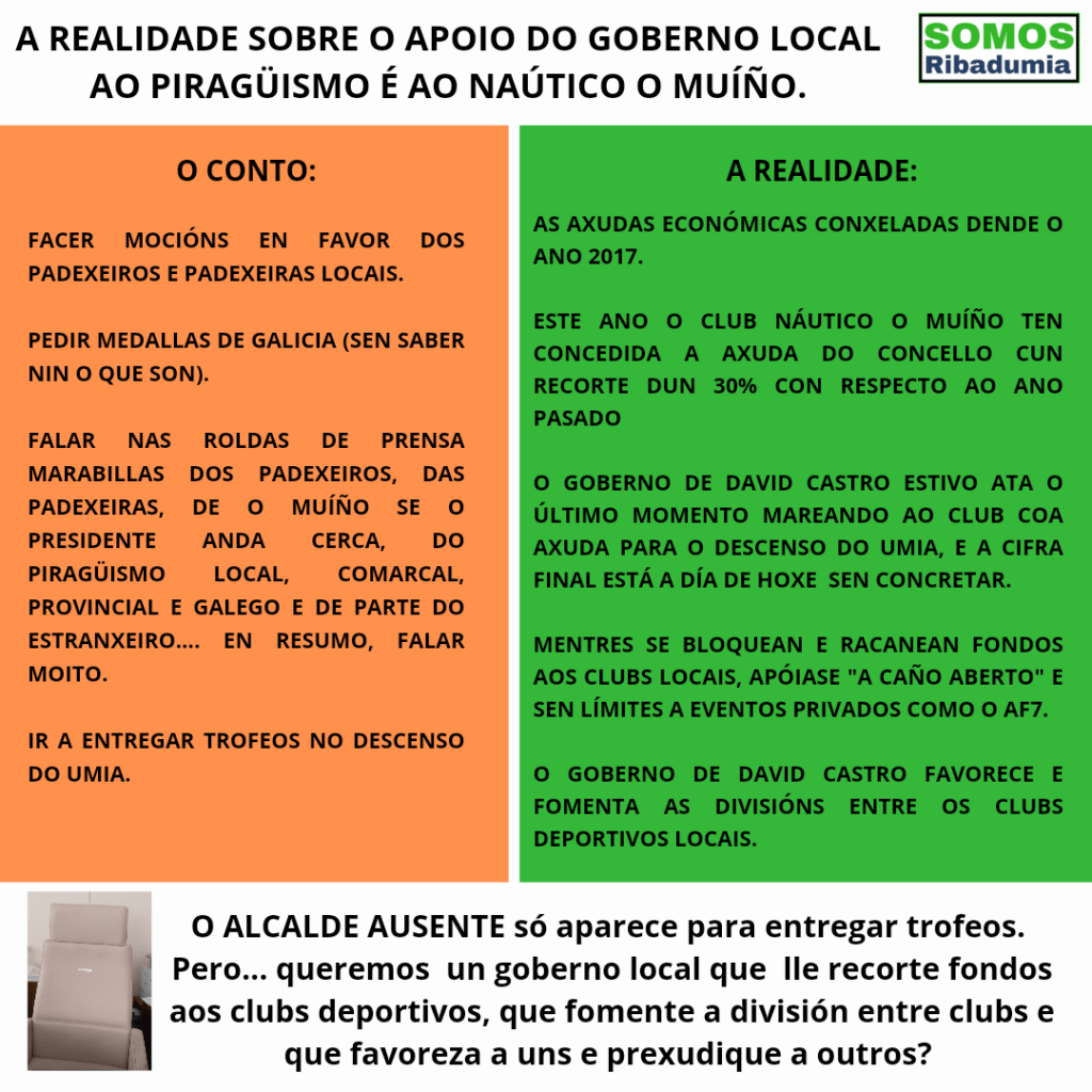 Dende Somos Ribadumia ademais de lamentar a falta de visión do goberno local, e o seu afán electoralista, queremos ademais recordarlle a David Castro que o que precisan o Náutico O Muíño e Manuel Fontán non son mocións, son recursos e cartos. O goberno local leva anos negándose a ampliar as partidas das axudas anuais, co resultado de que co aumento de clubs deportivos este ano o piragüismo veu reducida a súa axuda en case un 30% con respecto ao ano anterior. Unha diferenza económica importante. Non so iso, o propio goberno local admitiu en pleno que a día de hoxe non está confirmada a cantidade coa que se vai axudar a pagar o Descenso do Umia, deixando ao club ao pairo e a proba do ano próximo sen garantías de poder realizarse.