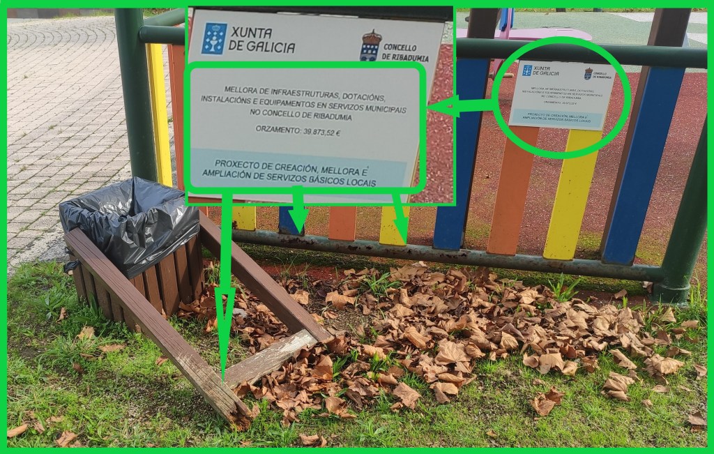 Pero dende Somos Ribadumia preguntámonos, unha vez máis, en que gasta David Castro os nosos cartos. Esta semana fixemos unha visita aos parques infantís de Ribadumia, e somos incapaces de entender en que fundeu o goberno eses 48.000€, dedicados supostamente nunha parte importante segundo se dixo no pleno a “posta a punto de TODOS os parques infantís”, pois os parques, xa non é que en xeral presenten a mesma imaxe de abandono dos últimos anos, senón que non hai ningunha mellora realizada.