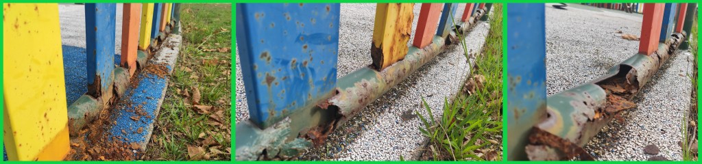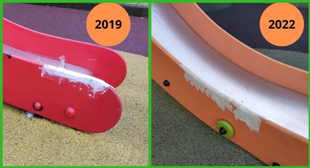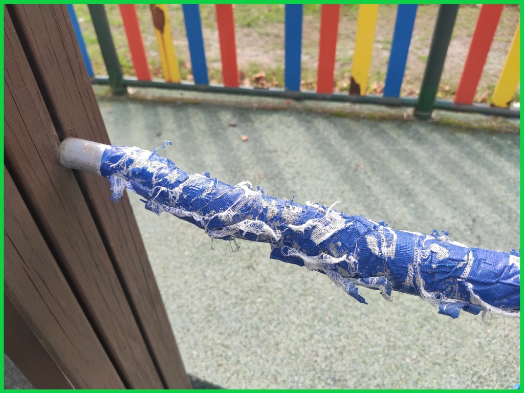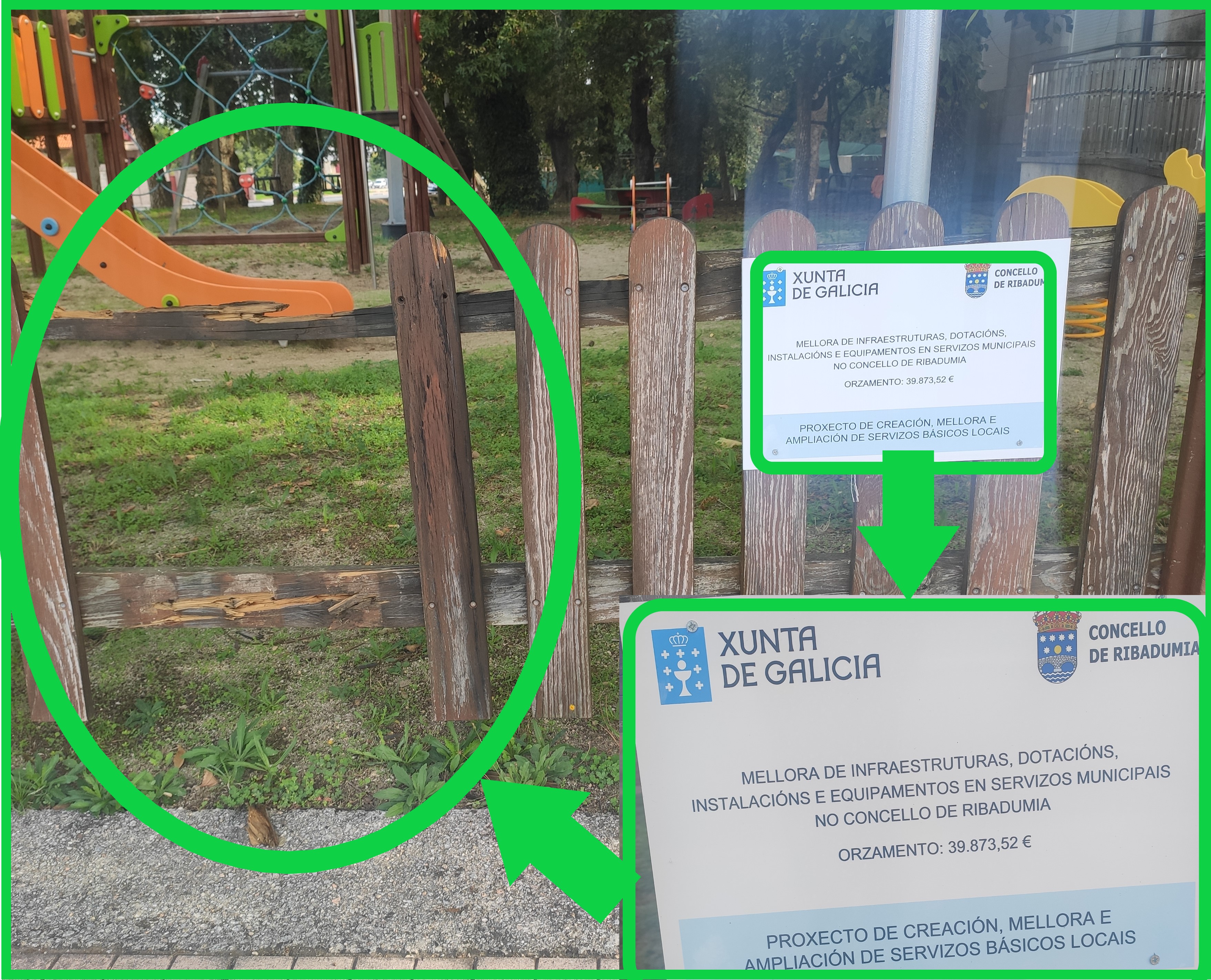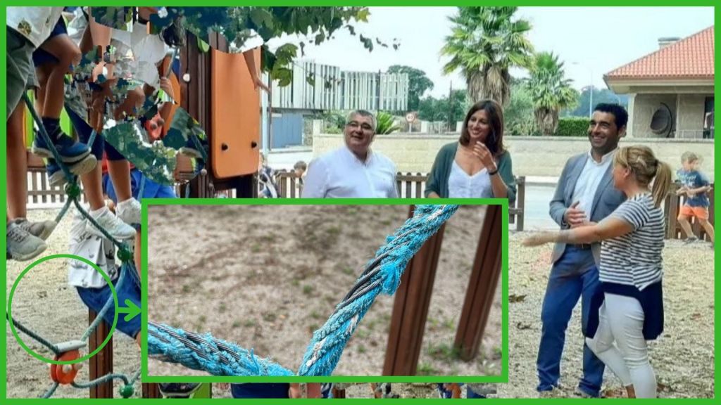 De feito, a imaxe dos parques infantís chegou a un punto moi dramático. En Sisán o caucho do chan estase esfarelando, no parque infantil de barrantes ten buracos importantes quedando o formigón de debaixo á vista, e en Leiro está cuberto dunha capa de verdín que o converte nunha perigosa pista de patinaxe; todas as redes das canchas están rotas; en Lois o brazo dun tobogán leva roto dende o verán do ano 2019, e non sabemos como foi posible, pero a madeira foi pintada sen que ninguén reparara a rotura, que está apañada polas mestras da aula infantil, para evitar feridas nas crianzas; en Barrantes, unha tea de araña de corda foi “apañada” con cinta americana, unha chapuza que agora loce toda desfeita, e unha tea similar en Ribadumia ten os arames á vista, sendo un perigo para a rapazada. E en xeral, a falta de limpeza e de coidados é moi evidente.