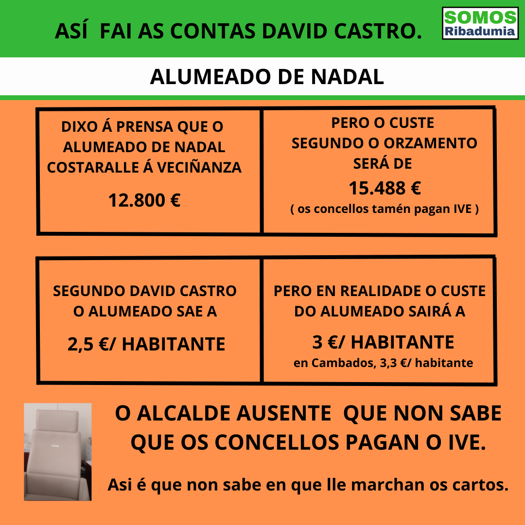 Dende Somos Ribadumia non podemos amosar máis que sorpresa pola resposta e actitude de David Castro. Á vista das críticas que recibiu polo lamentable alumeado de nadal decidiu, para tentar desactivar esas críticas, facer públicas as trampas contables que realiza. E ao facelo demostrou que a realidade é aínda peor da que nós expuxemos. No económico porque demostra que David Castro non ten control sobre os números, e que ademais fai trampa dotando cartos para cousas distintas ás que pretende pagar. E neste caso concreto porque ademais nós facíamos idea de que había desidia no trato coa empresa do alumeado, pero non pensamos que chegara a este nivel tan baixo. Porque o peor de todo isto é que no orzamento dota cartos, polo tanto non é un problema económico, o que nos leva a ter este alumeado tan pobre e cutre, é sinxelamente a vagancia dun alcalde que ten ao concello completamente abandonado, “ata o punto de que que nalgo como o alumeado de nadal, que non é o dunha verbena, non se molesta nin en falar coa empresa do alumeado e ver opcións dispoñibles para tratar de ter un concello decorado acorde aos tempos. Limítase a dicirlle á empresa que ten os mesmos cartos que o ano anterior e que fagan o que consideren. E a empresa así fai, e así nos tocan os restos dos alumeados que ninguén quere. Pouco pagas, menos levas, di o refrán.”