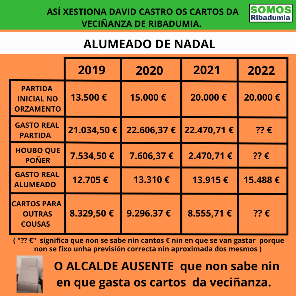 Resulta que David Castro leva anos enganando á veciñanza co orzamento e a xestión económica do Concello. E aínda ten a cara dura de ofrecernos un exemplo claro. No relativo ao alumeado de nadal, as partidas recollidas no orzamentos foron de 13.500 € (2019) , 15.000 € (2020) e 20.000 € (2021 e 2022). Iso foi o que David Castro dixo que ia gastar nestes anos no alumeado de nadal. Porén, o gasto real nesas partidas, foi de 21.034,50 € no ano 2019, de 22.606,37 € no 2020 e de 22.470,71 € no ano 2021. Eses son os números oficiais. Agora a eles hai que incluírlles que David Castro por fin deunos acceso ás facturas, que demostran que a maior parte deses cartos non se dedicou ao alumeado de nadal, que so se levou 12.705€ no 2019, 13.310 € no 2020 e 13.915 € no 2021. David Castro pretende tratarnos de mentireiros, pero nós limitámonos a traballar cos números oficiais, se resulta que o goberno local entrampa os números non é responsabilidade nosa, pero alégranos que se faga público.