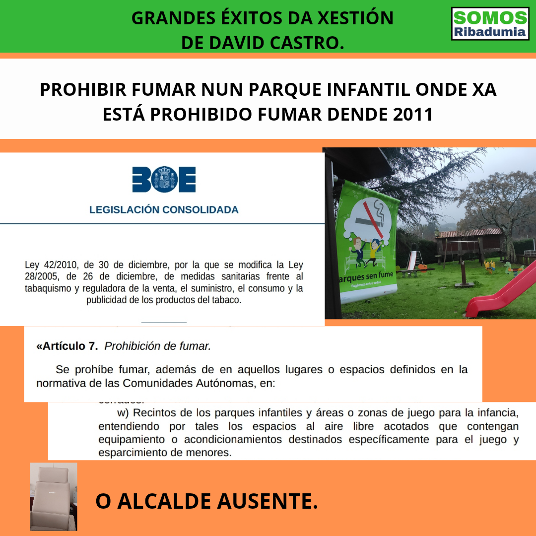 Tal como explica o noso voceiro, Enrique Oubiña “dase a circunstancia de que nos parques infantís está prohibido fumar dende o 2 de xaneiro de 2011, tal como establece a lei 42/2010, do 30 de decembro, que expón moi claramente no seu artigo 7 que esta prohibido fumar nos recintos dos parques infantís e áreas ou zonas de xogo para la infancia, entendendo por tales os espazos ao aire libre acoutados que conteñan equipamento ou acondicionamentos destinados especificamente para o xogo e o esparcemento de menores. Polo tanto, David Castro pretende prohibir fumar nun lugar onde xa está prohibido fumar dende fai doce anos.”