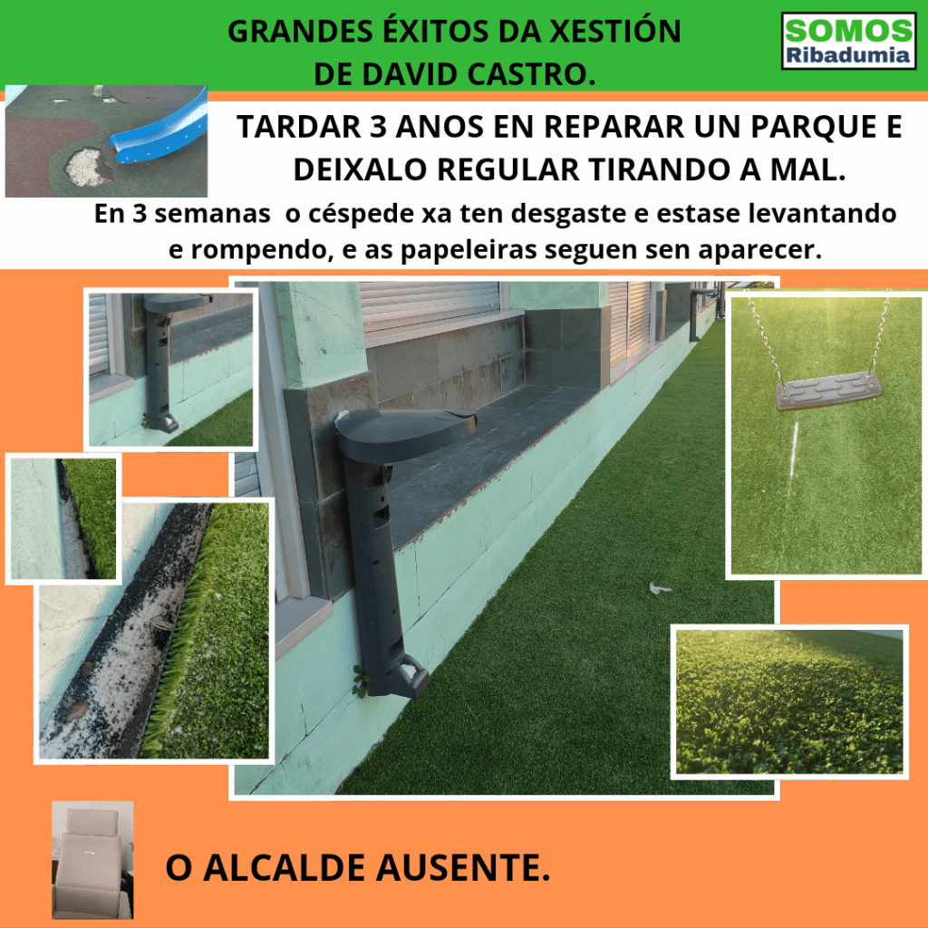 Por outra banda, tampouco o resultado final convence a ninguén. “O cespede non é unha mala solución, pero son materiais que hai que poñer con moito coidado. Neste caso parece que se colocou usando de base o caucho anterior, que estaba moi deteriorado, e o resultado diso é que o cespede que a simple vista parece chan e plano, ten moitas irregularidades que provocan tropezos, ademais de que non é o mateiral máis adecuado para colocar en determinados puntos, como nos columpios, onde xa se nota desgaste”. Máis aló disto, a sílice non foi ben cepillada nin se retirou a sobrante, que se acumula nos laterais do parque, por onde ademais o cespede, tres semanas despois de abrir o parque, estase despegando e comeza a deteriorarse en varios puntos. Tampouco se volveron colocar as papeleiras, moi necesarias, e en xeral a imaxe é, como se prevía, de terse feito un parche para aparentar e tapar as críticas.