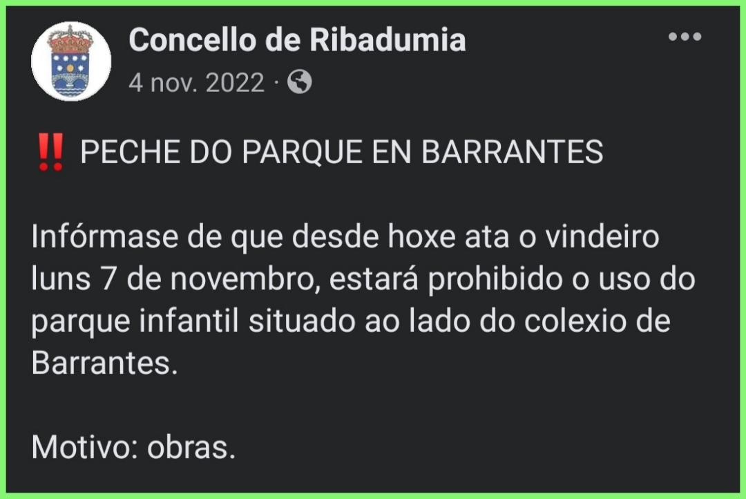 O concello non deu ningún tipo de explicación, a pesar de que as queixas chegarón ás redes sociais, e de feito non chegou a comunicarse que o parque volvía estar aberto ao púbico en ningún momento. Tal como explica o noso voceiro, Enrique Oubina, “foi gracias á dirección do CPI Xulia Becerra Malvar, que chamou ao concello á volta do parón de nadal, que dende o Concello se acordaron de que había un parque en Barrantes pechado ao público, e procederon a informarlle ao Concello de que o parque estaba perfectamente operativo. Se o director non chega a chamar ao Concello, seguiriamos con el pechado”.