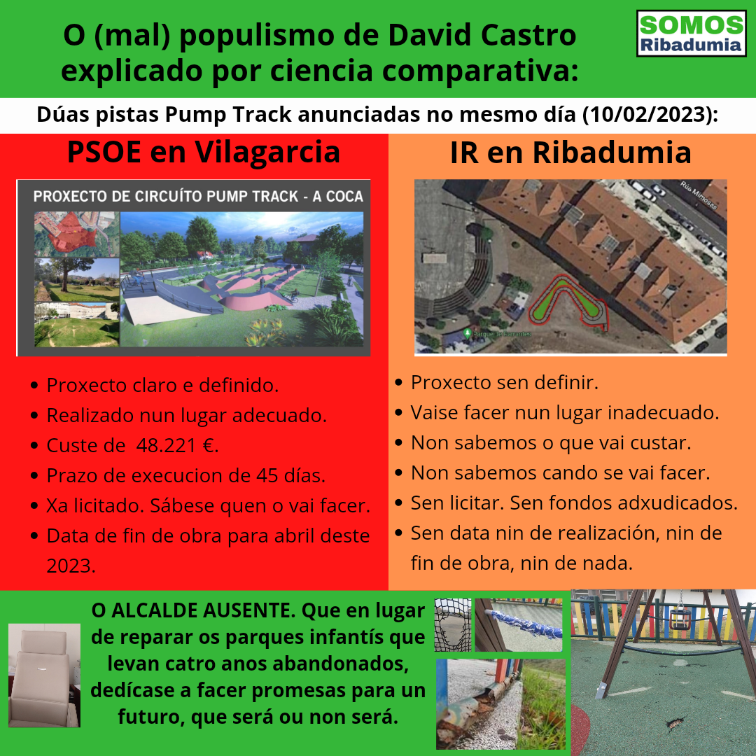 Dende Somos Ribadumia temos claro que o núcleo de Barrantes precisa mellorar en moitos aspectos urbanísticos. E que hai que dotar elementos como ese pump track para a xente moza ou outras instalacións para xente menos nova, como parques de calistenia e, nese parque concreto, zonas de sombra, fontes de auga, aseos… Pero nada diso se pode facer de calquera maneira, nin moito menos anunciar obras sen xeito nin dereito mirando o calendario electoral. Hai que actuar con sentido, tendo un proxecto integral, ben elaborado e adecuado aos espazos públicos e que estableza as necesidades que se deben atender. E o máis importante, antes de nada, hai que manter o que se ten, e non deixar que todo se pudra para logo poñerse a facer promesas para o posibles futuros agardando así xuntar catro votos.