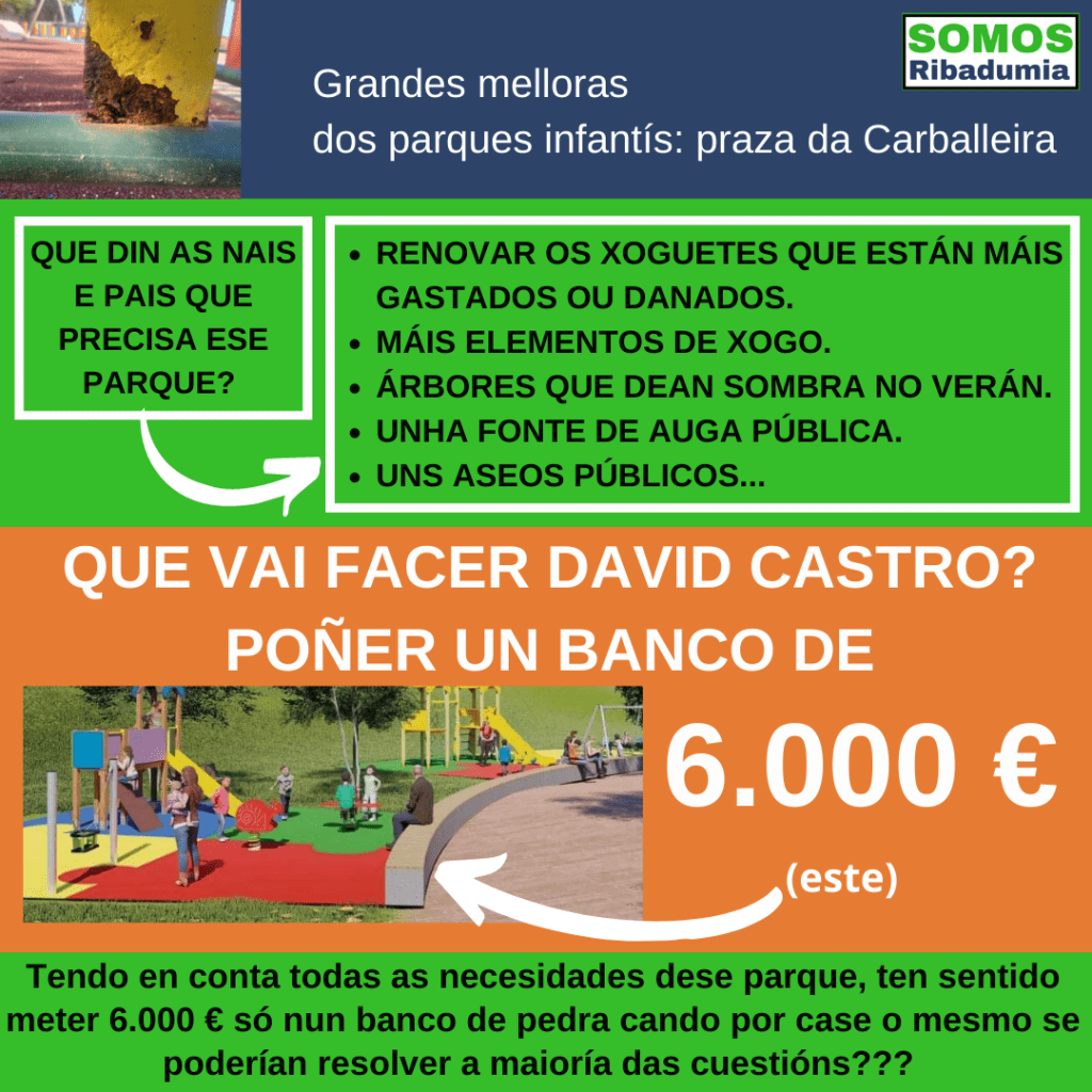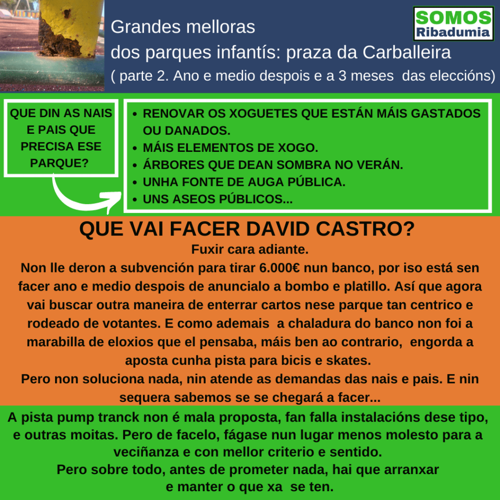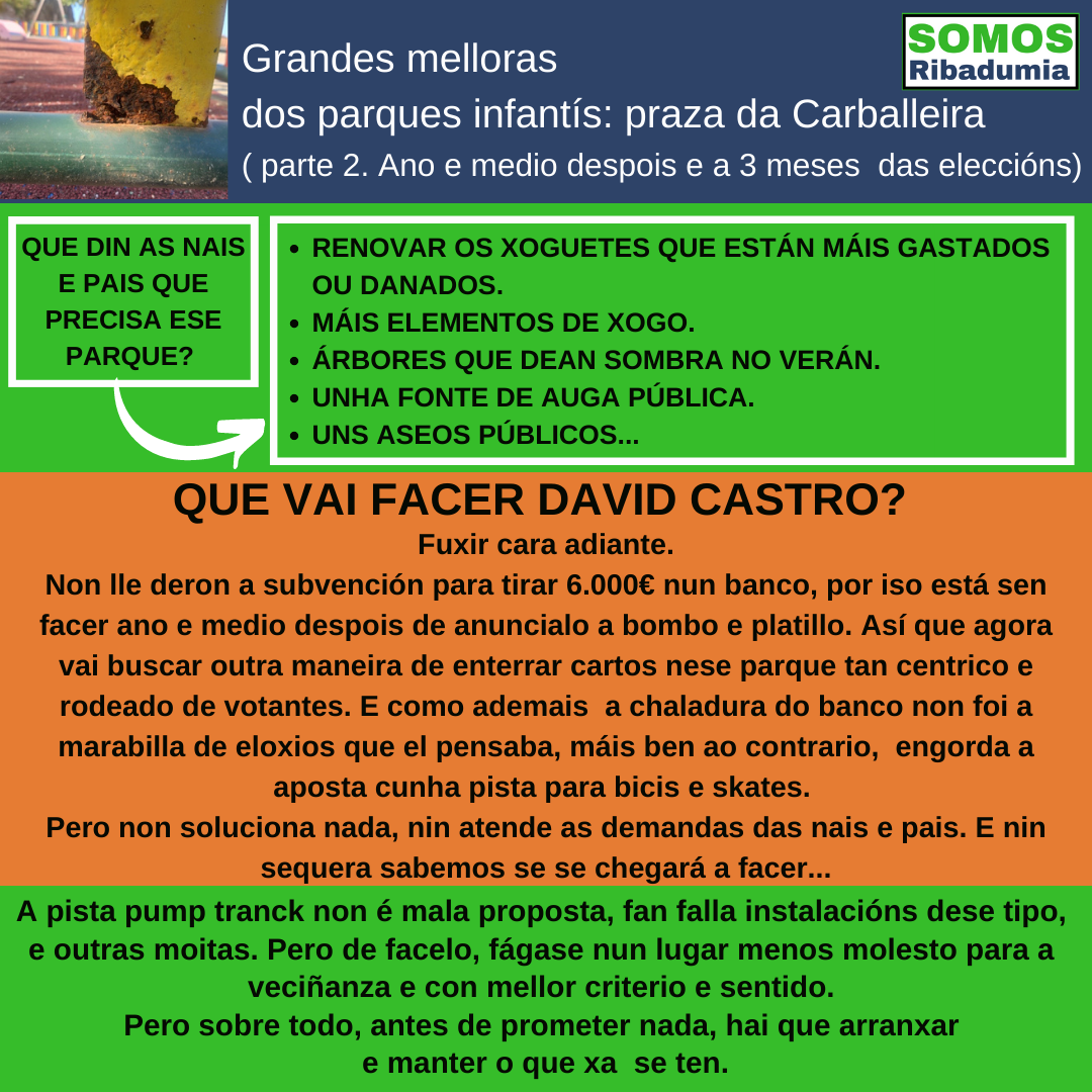 - David Castro rise da veciñanza. Catro anos de abandono do parque infantil da praza da Carballeira, e en vez de reparar o deterioro, fai anuncios electoralistas.