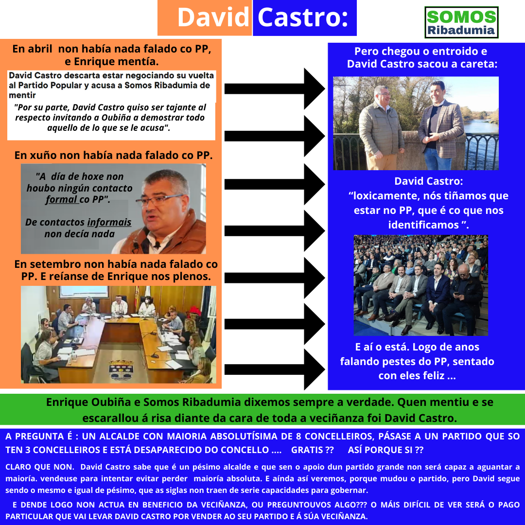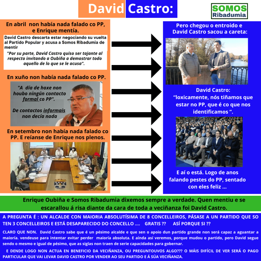 O anuncio de que David Castro se vendeu ao PP non nos sorprendeu, pois dende Somos Ribadumia coñeciamos o que se estaba cocendo dende fai anos, e de feito fixemos público que David Castro estaba negociando a súa integración no PP en abril do ano pasado, pero, como explica o noso voceiro Enrique Oubiña “xa na lexislatura anterior David Castro amagou co cambio, e a ninguén lle escapa a súa proximidade a Gonzalo Durán, sen o cal David Castro non é capaz de moverse.