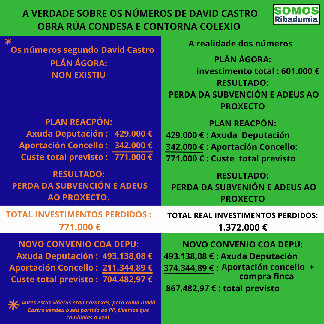 En primeiro lugar o baile das cifras. David Castro, tal como explica o no noso voceiro Enrique Oubiña “minteu no pleno cando dixo que no seu momento perdeu 400.000 € do plan ReacPon. A realidade é que David Castro perdeu os 601.000€ do plan Ágora, e os 771.000 € do Plan ReacPon, pois estas son as cifras dos investimentos totais previstos neses dous plans, en base aos proxectos presentados polo goberno local. E perdeunos por dous motivos, o primeiro pretender xogar a picaresca presentando o mesmo proxecto a dúas liñas de axuda distintas, podendo presentar dous plans distintos e realizar desta maneira investimentos por valor 1.372.000 € no noso Concello. O segundo por non solicitar a titularidade do tramo de vía afectado, que era da Deputación”.