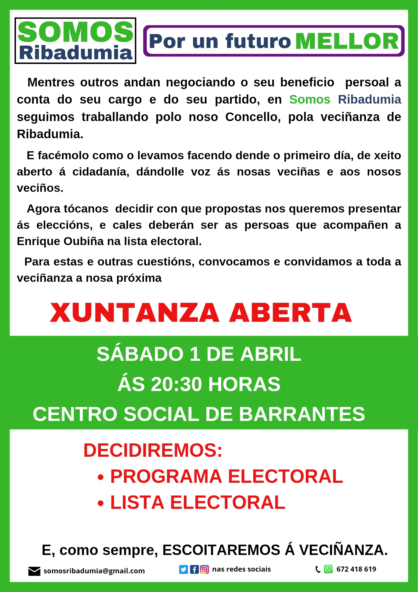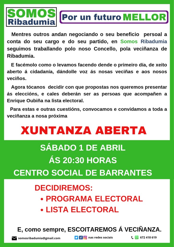 Este proceso iniciouse en novembro cando, mentres outros negociaban en privado a venda do seu partido ao Partido Popular de Galicia, nós escolliamos de maneira aberta e transparente ao noso candidato, Enrique Oubiña. Agora, tócanos repasar o noso programa de goberno, actualizandoo as necesidades actuais, e tamén decidir que persoas deberán acompañar a Oubiña na lista electoral. Con eses obxectivos e baixo o lema “por un futuro MELLOR”, convocamos unha xuntanza aberta á veciñanza para este próximo sábado. Nela aprobaremos o noso programa marco, con medidas de curto, medio e longo prazo para mellorar a calidade de vida da nosa veciñanza e devolver a Ribadumia á senda pola que xa transitan á maior parte dos concellos da comarca, e da que David Castro nos apartou nestes catro anos de abandono e desidia, ao longo dos cales unicamente se preocupou por asegurarse un futuro vivindo da política.